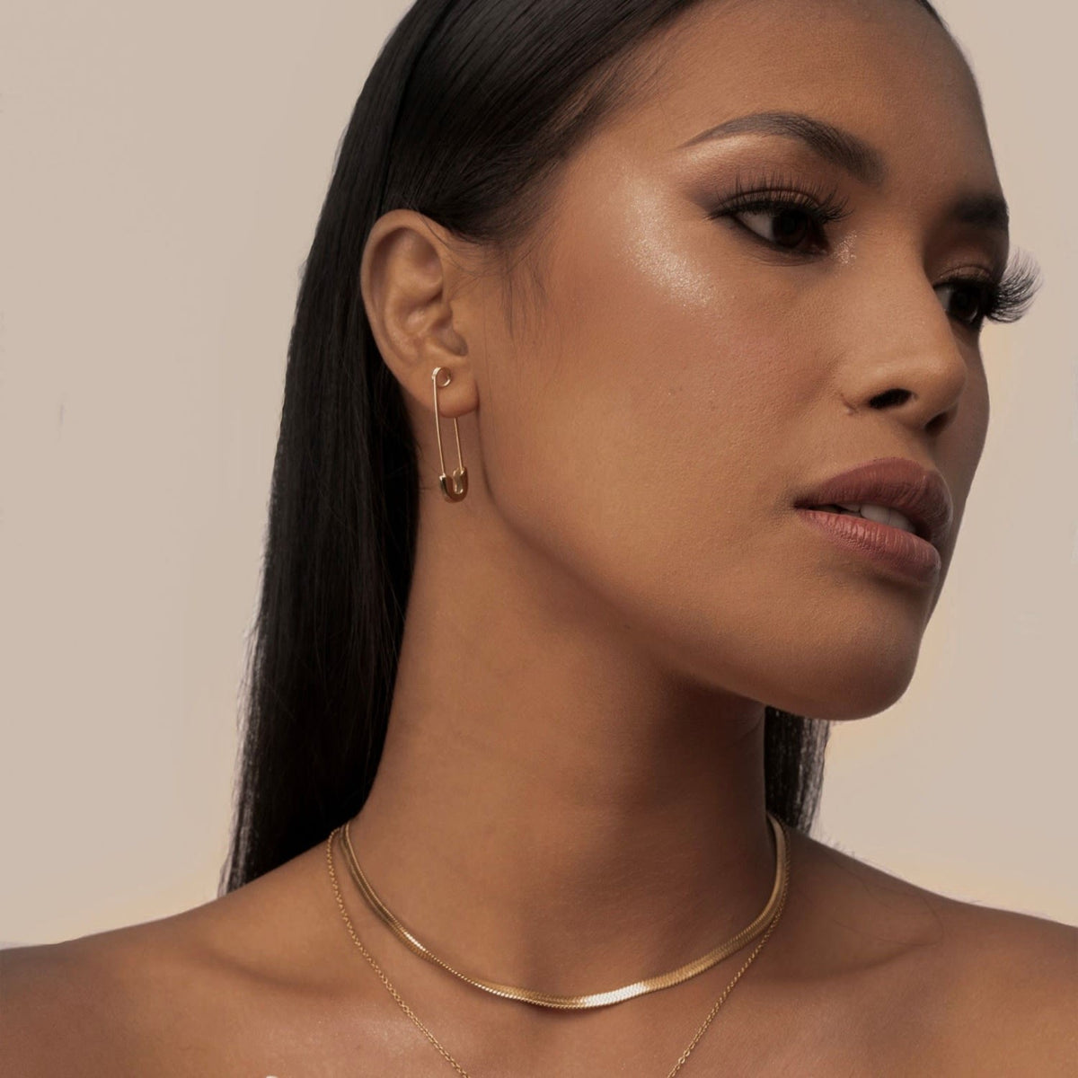 These Gil Safety Pin Statement Earrings by Viea are playful yet polished, reimagining a familiar everyday object into a chic, fashion-forward accessory. With their quirky silhouette, they embody confidence, individuality, and unconventional elegance. Ideal for those who love to make a statement, they pair effortlessly with cuffs or mismatched earrings for a contemporary layered look.