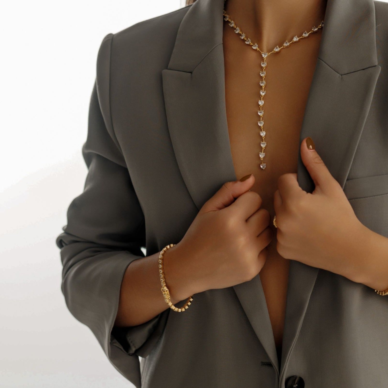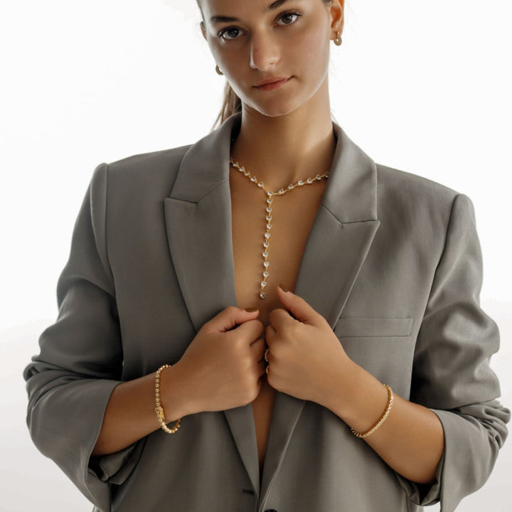 This bracelet is crafted from high-quality 18K gold-plated brass and features octagonal cubic zirconia stones. It is hypoallergenic, waterproof, and non-tarnish.
