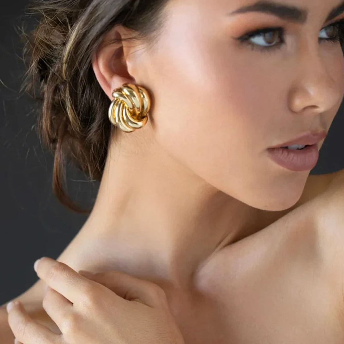 These earrings are made from 18K gold plated stainless steel. They feature an intricate knot swirl design and are described as lightweight and hypoallergenic.