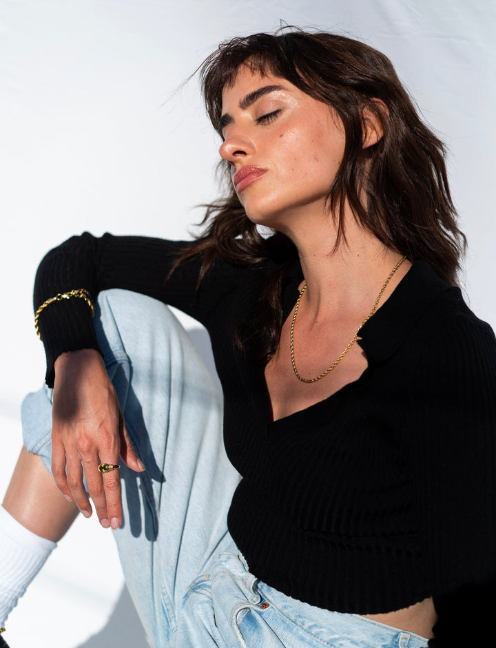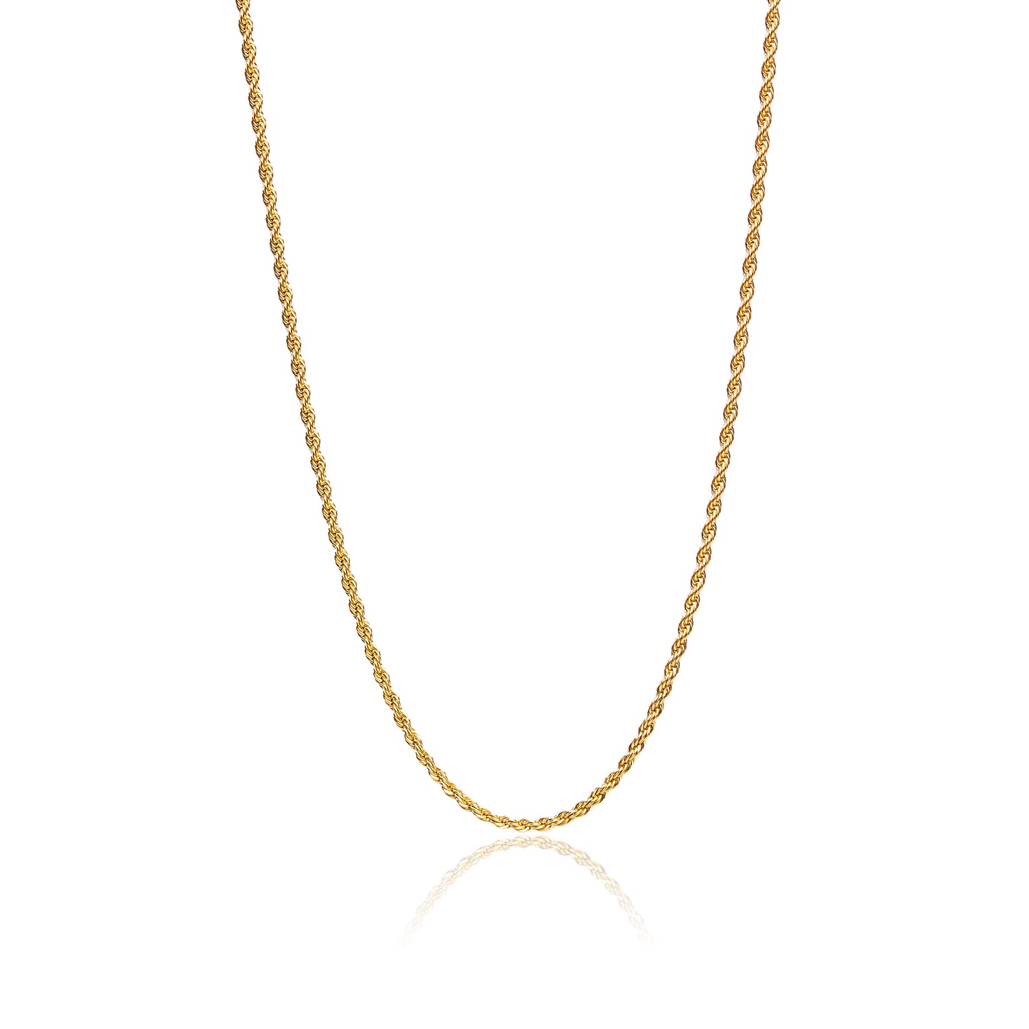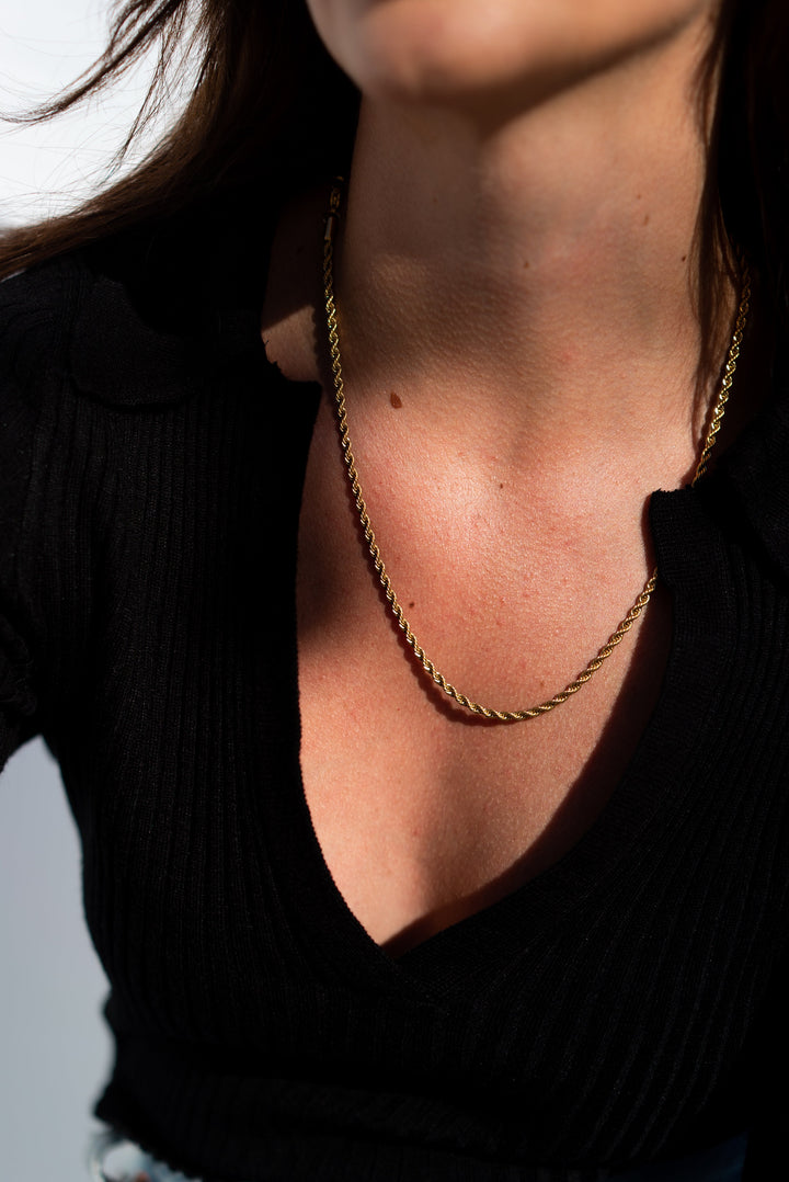 This necklace is crafted from 18K gold-plated stainless steel and features a delicate rope chain.