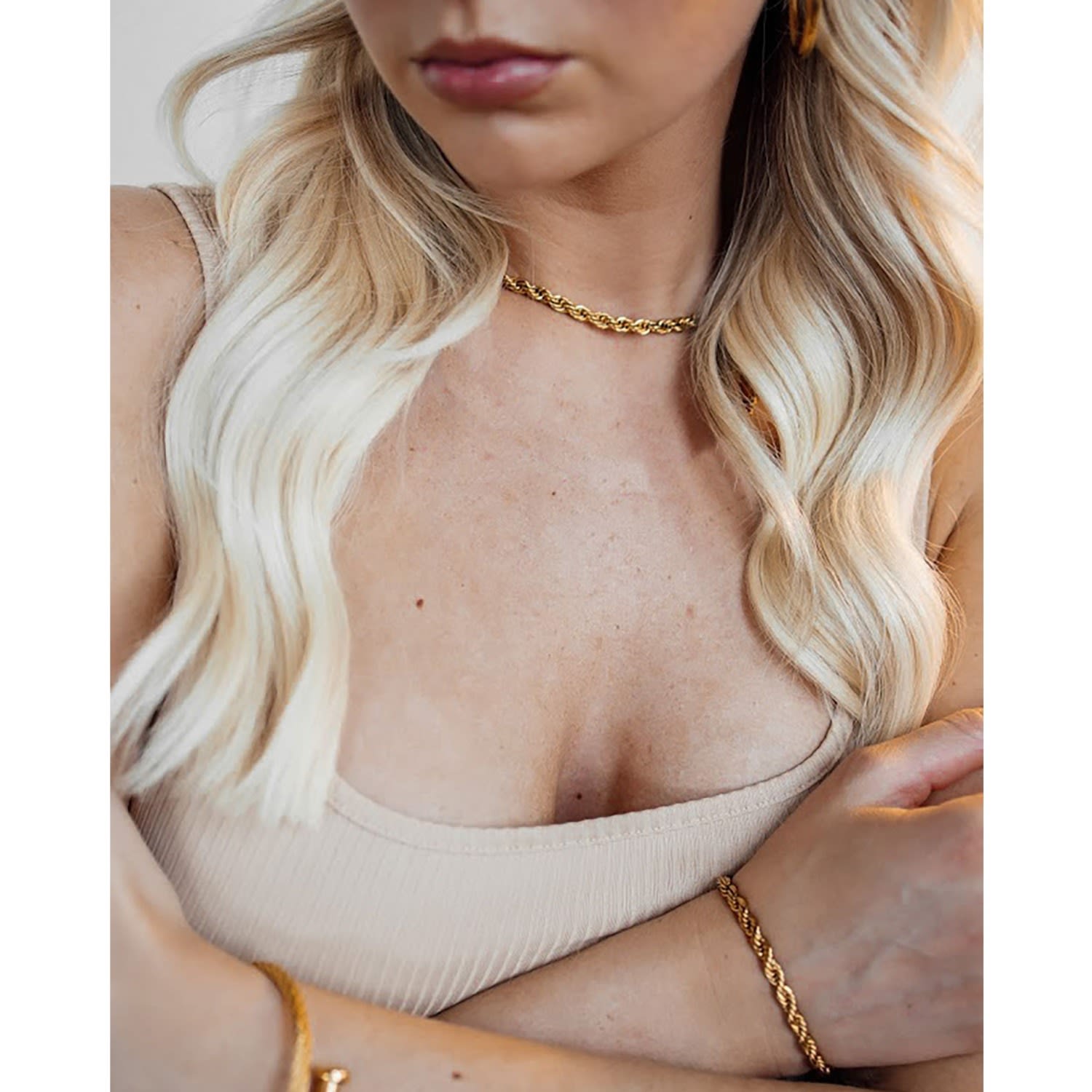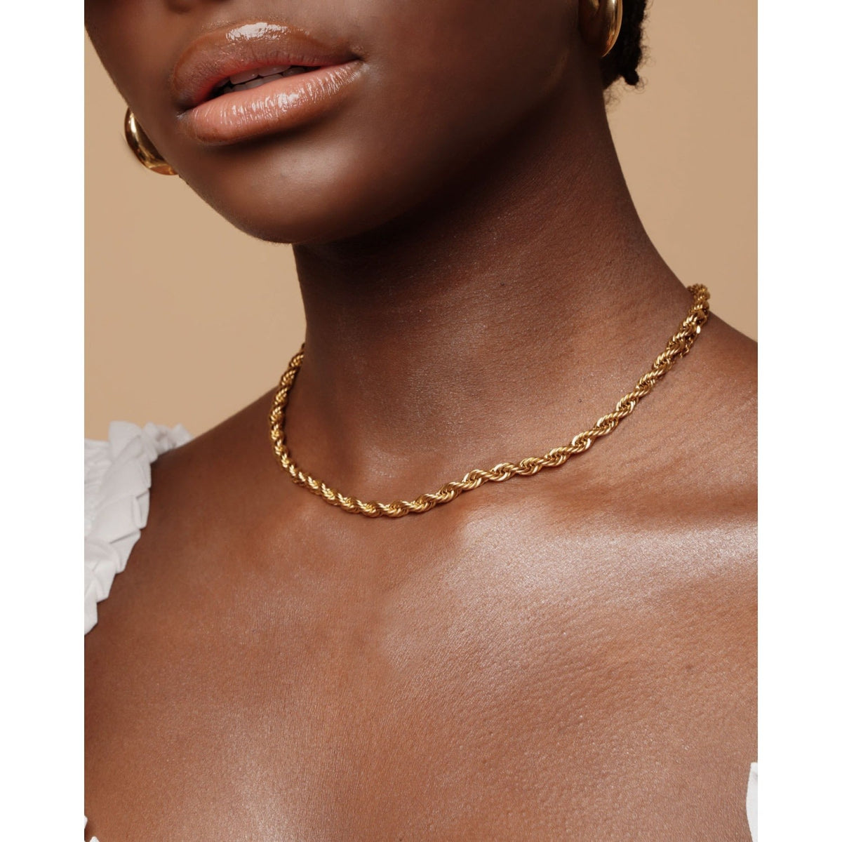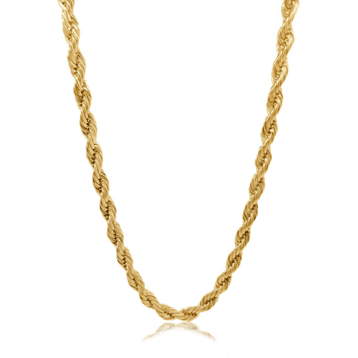 High-quality stainless steel coated in 18k gold. Features rope chain design with adjustable links and lobster clasp/parrot closure. Hypoallergenic, waterproof, and non-tarnish with protective anti-tarnish coating.