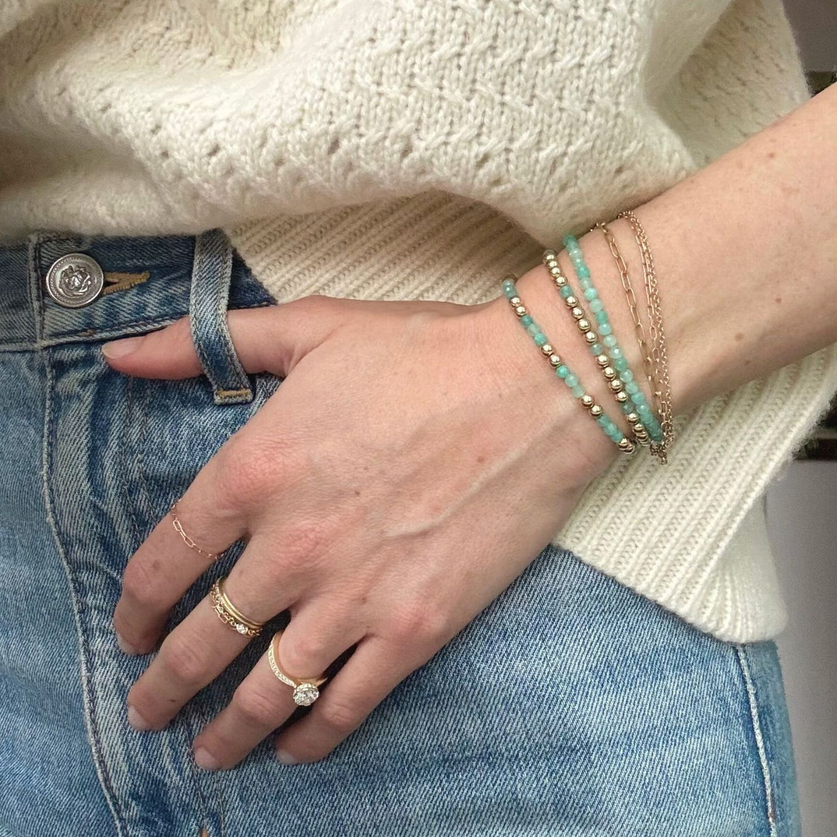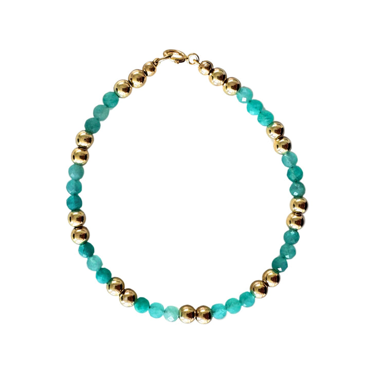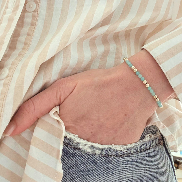 This bracelet is crafted with natural Amazonite semi-precious stones and 14K gold-filled beads.