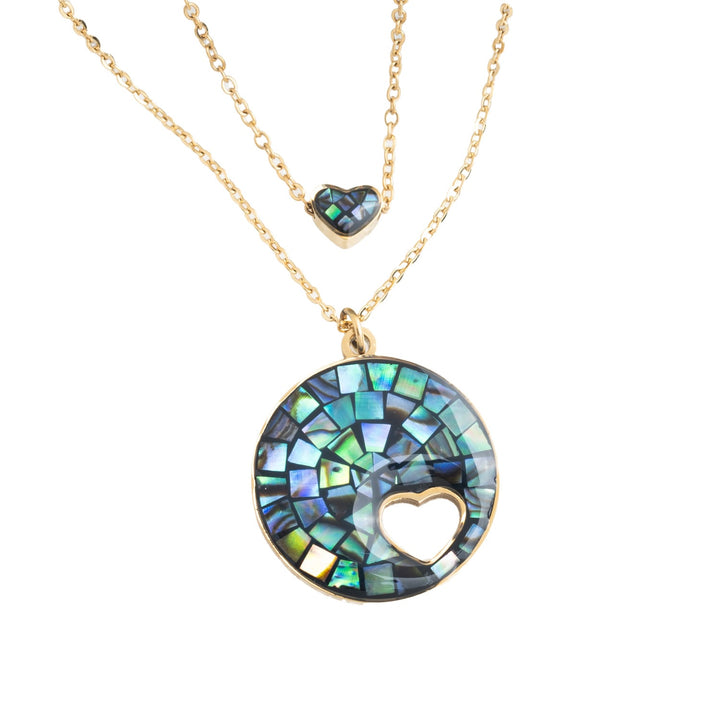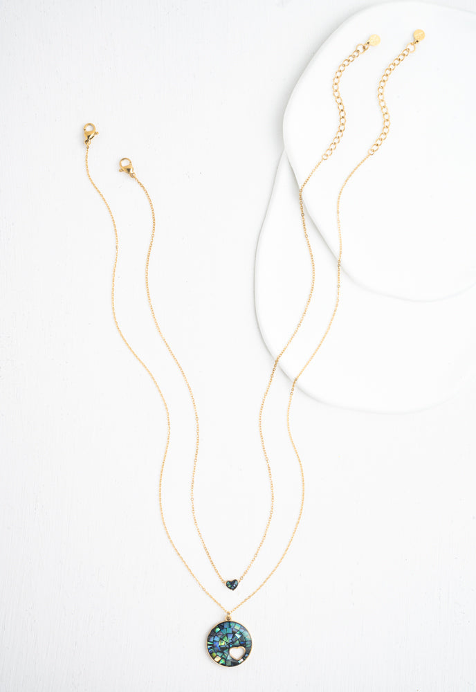 This Journey Together Necklace Set In Captivating Abalone by Starfish Project is a beautiful expression of unity and empowerment. The set features two necklaces with captivating abalone shells in rich blue and green tones. The larger pendant has a tiny heart cutout, symbolizing love and connection, while the smaller charm has a reversible design with a heart-shaped abalone on one side and gold on the other. This set is a meaningful and versatile accessory, perfect for sharing with a loved one.