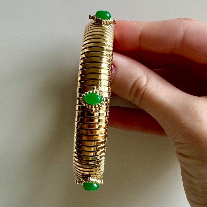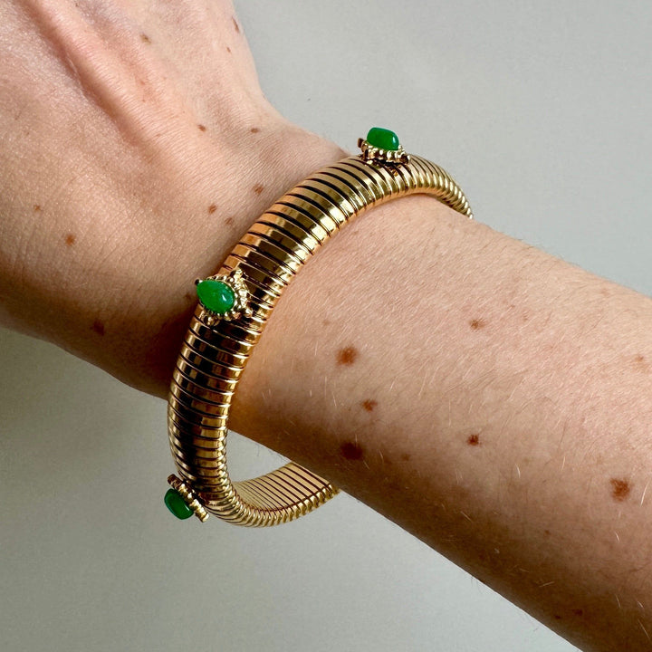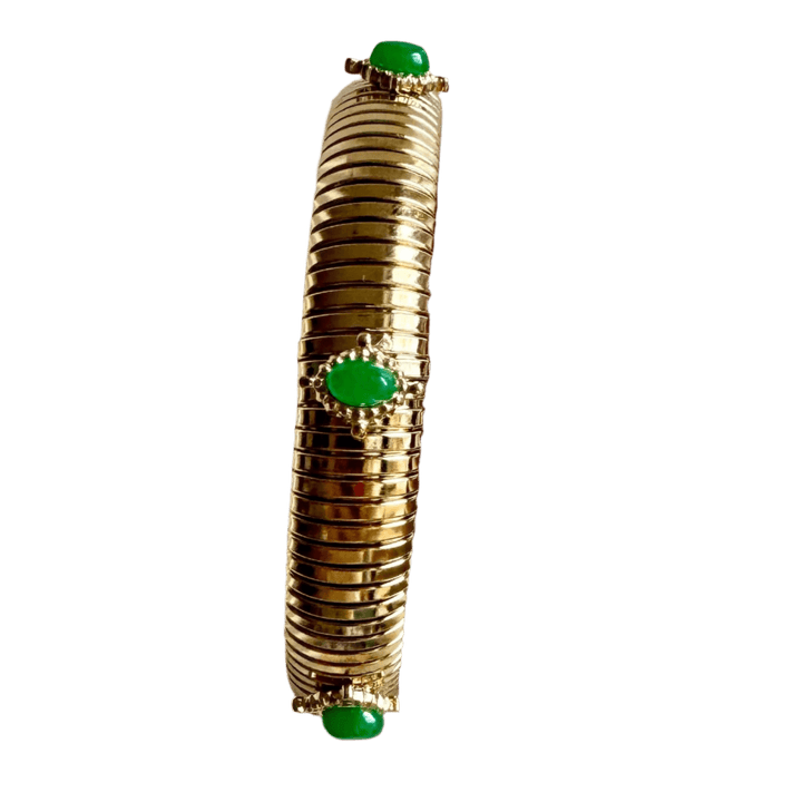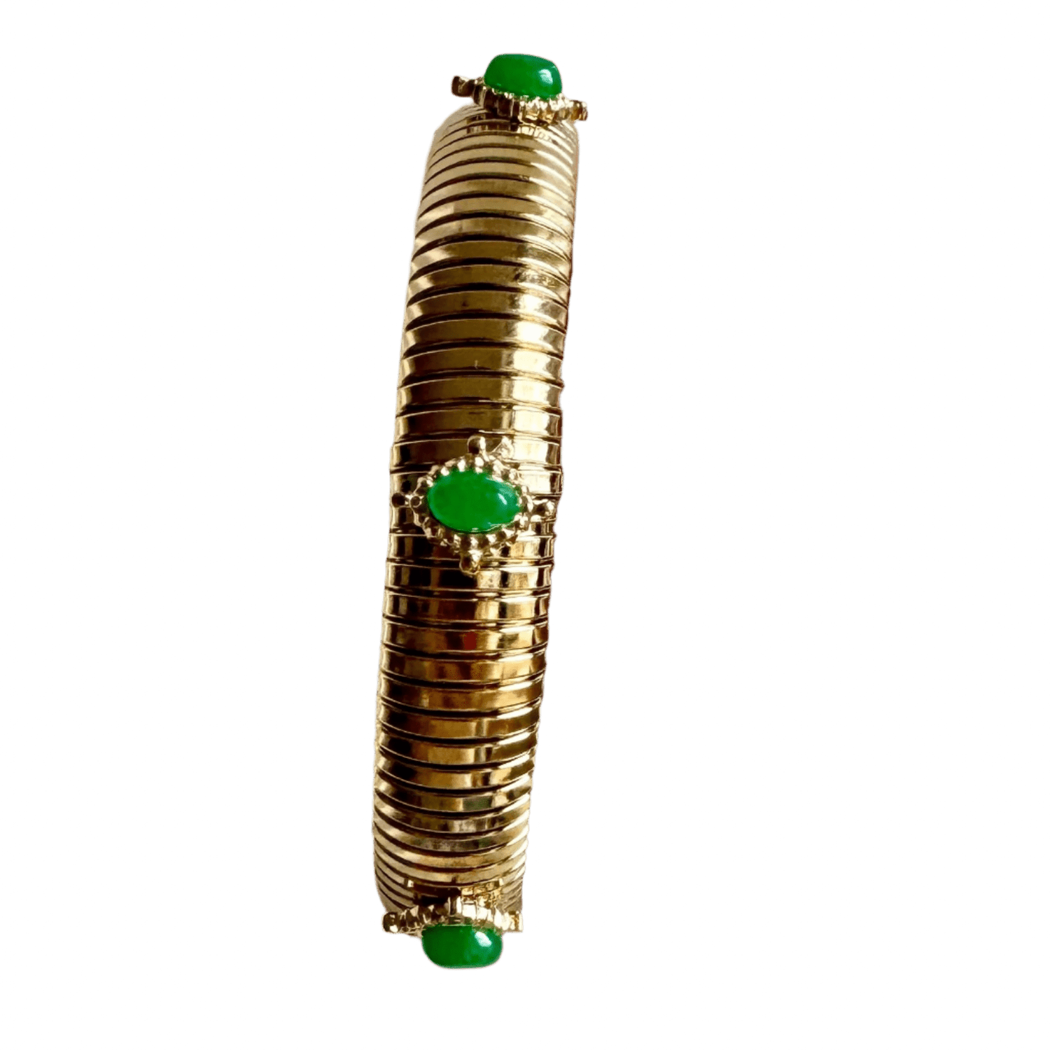 This bracelet is made of stretchy gold plate with green stone cabochons.