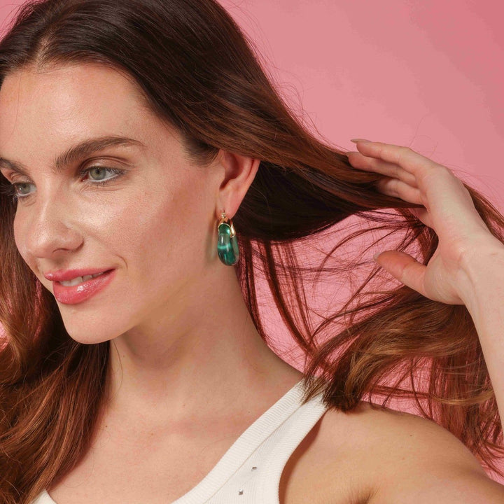 These hoop earrings are made of transparent teal resin and gold. They come with a velvet pouch.