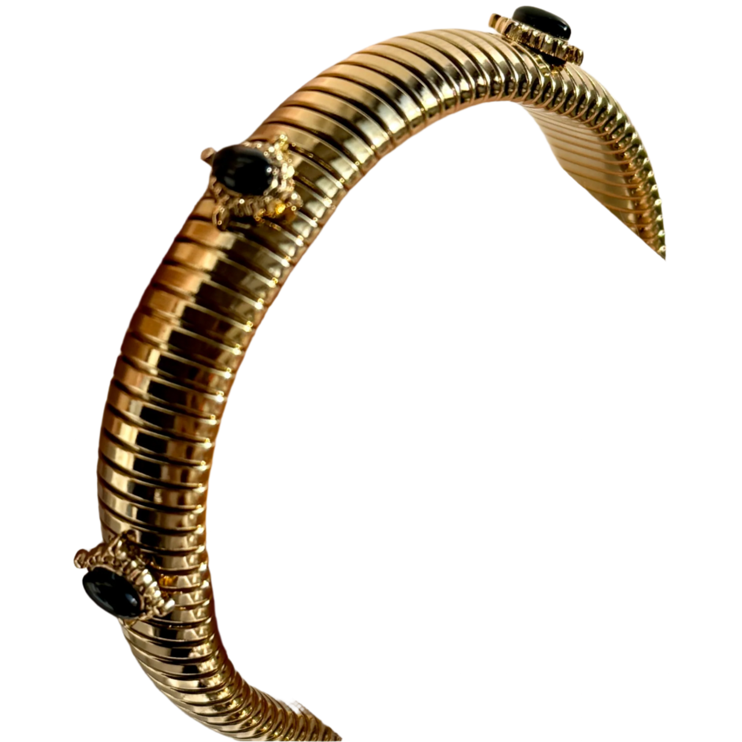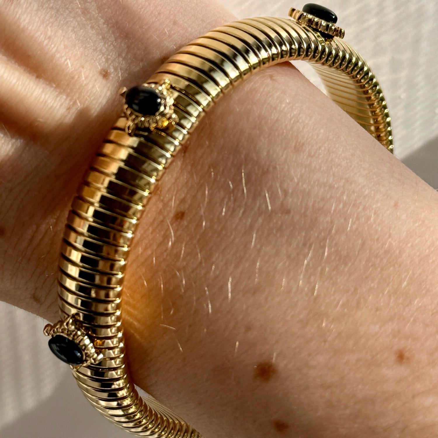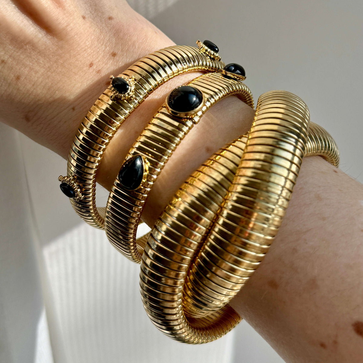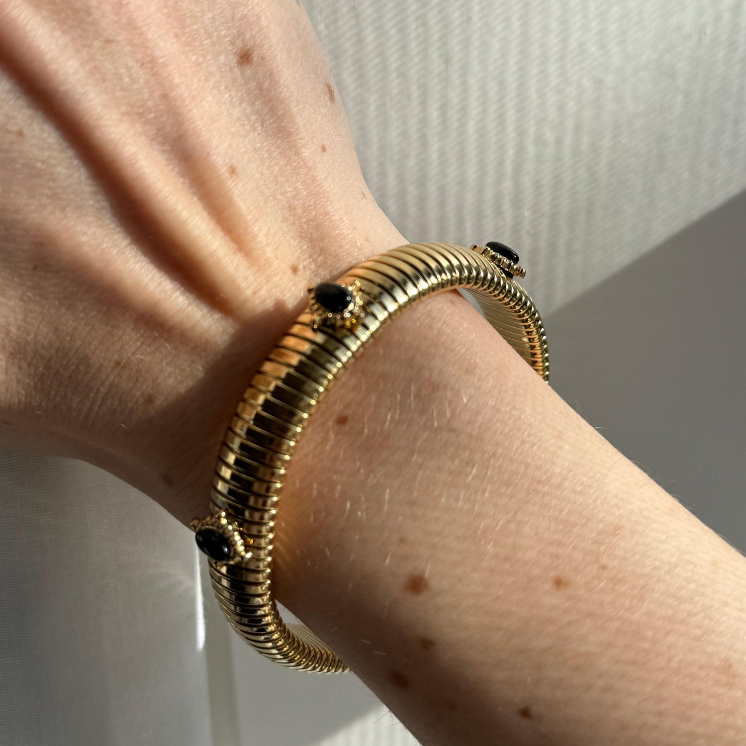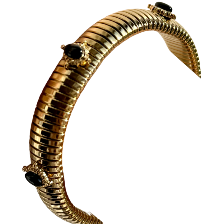 This Small Onyx Stone Gold Omega Bracelet by Laura Gray is a chic and easy addition to any stack. The lightly stretchy gold plate with delicate black onyx stones creates a stunning contrast that looks fabulous stacked with other bracelets. It's a modern and elegant piece for those who appreciate understated yet bold style.