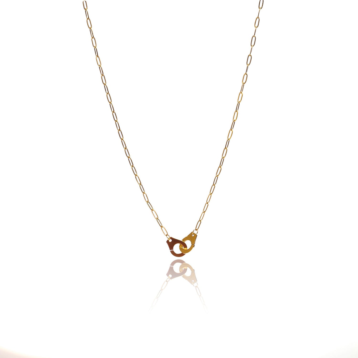 This Links Necklace by Tseatjewelry is a chic and versatile piece perfect for everyday use or glamorous nights out. The beautiful handcuffs design and the shine of the 18k gold plate create a stunning and eye-catching look suitable for all occasions. It's a bold and confident statement piece that sparkles in the light.