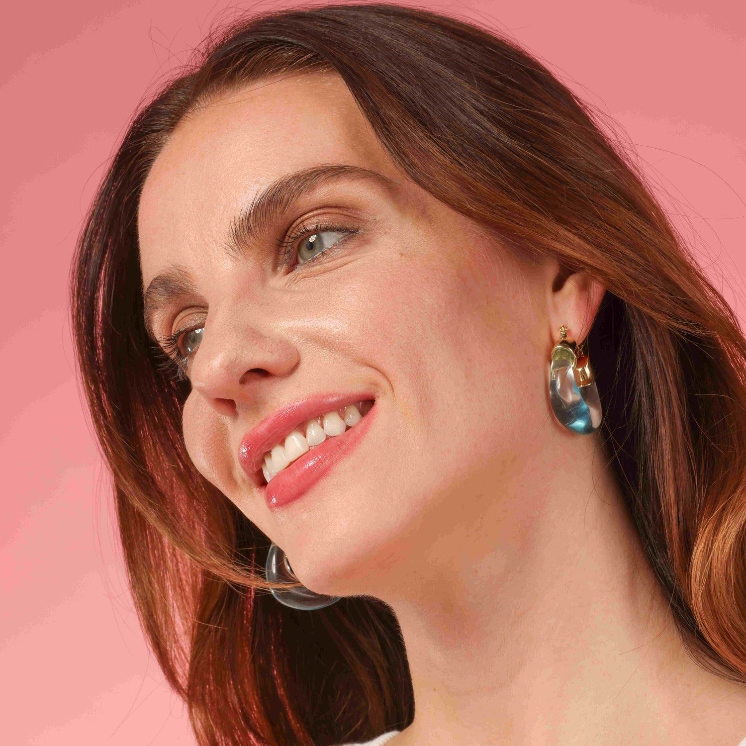 These hoop earrings feature transparent aqua resin and gold. They are designed to be lightweight and are described as "beautifully articulated."