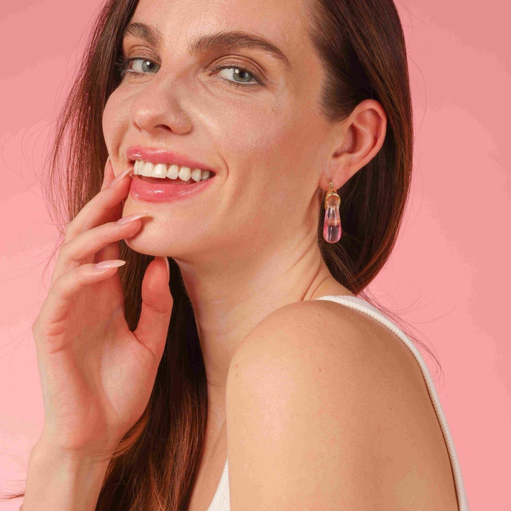 These hoop earrings feature transparent rose resin and gold. They are designed to be lightweight and are described as "beautifully articulated."