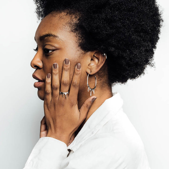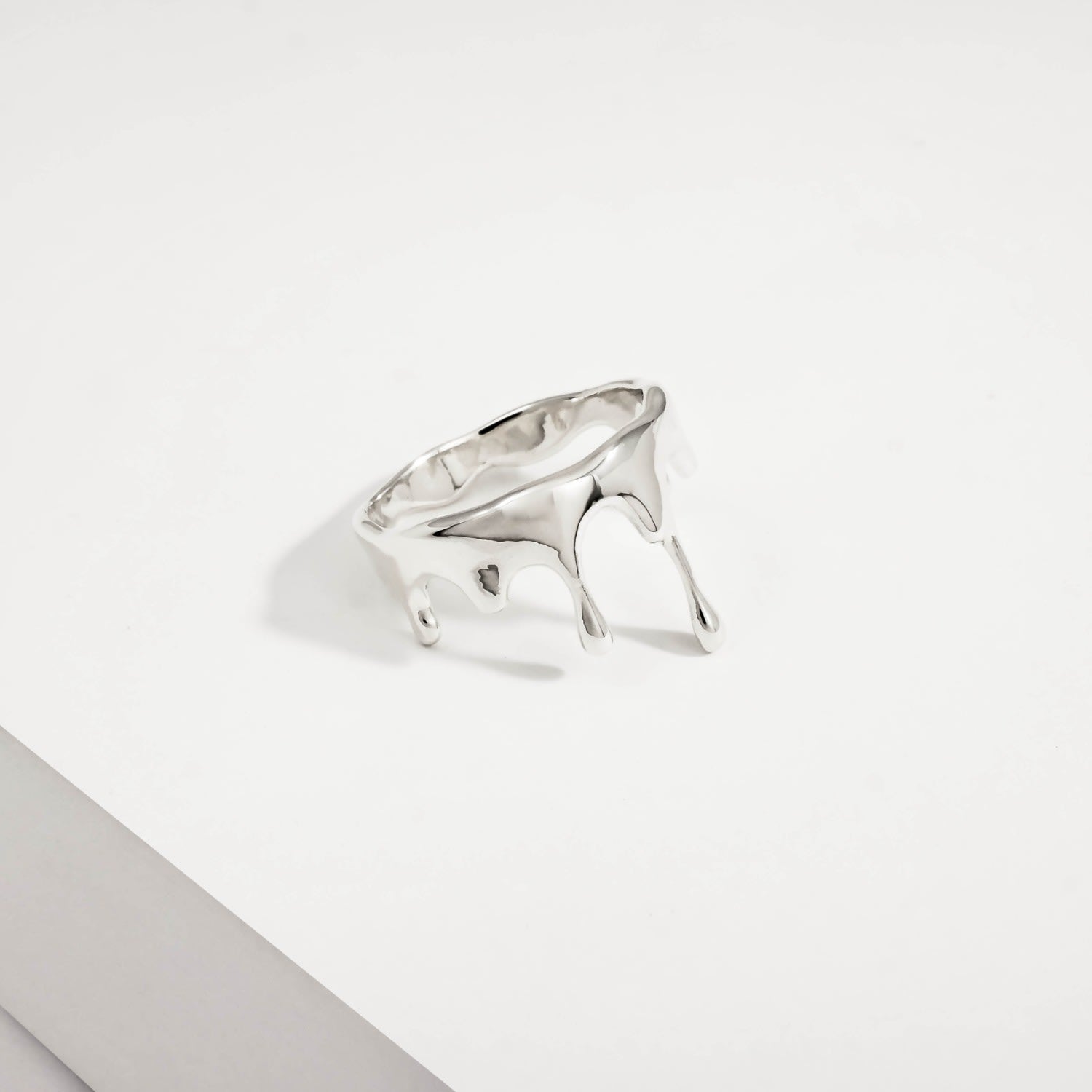 Handcrafted in sterling silver. Hypoallergenic and tarnish-resistant. Smooth band with dripping-inspired contours.