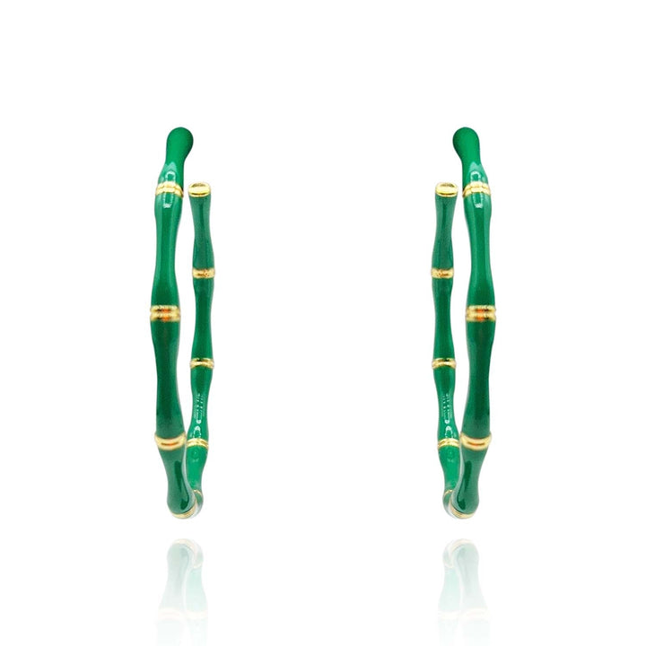 These hoop earrings feature a bamboo motif and are a combination of green and gold colors.