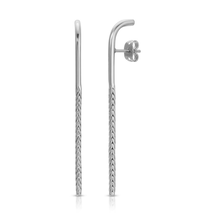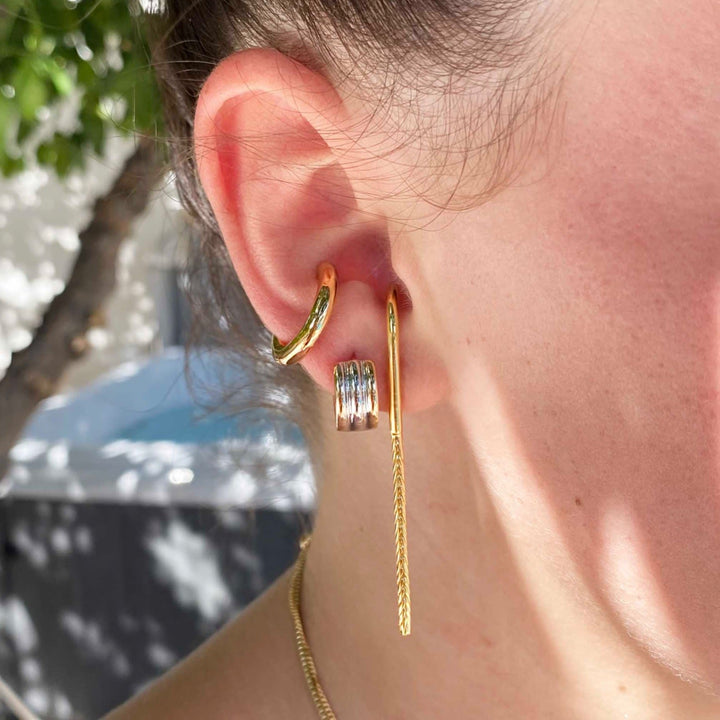 This earring is made from 14K Yellow Gold plated Brass or Rhodium plated Sterling Silver. It features a curved bar post and a snake chain.