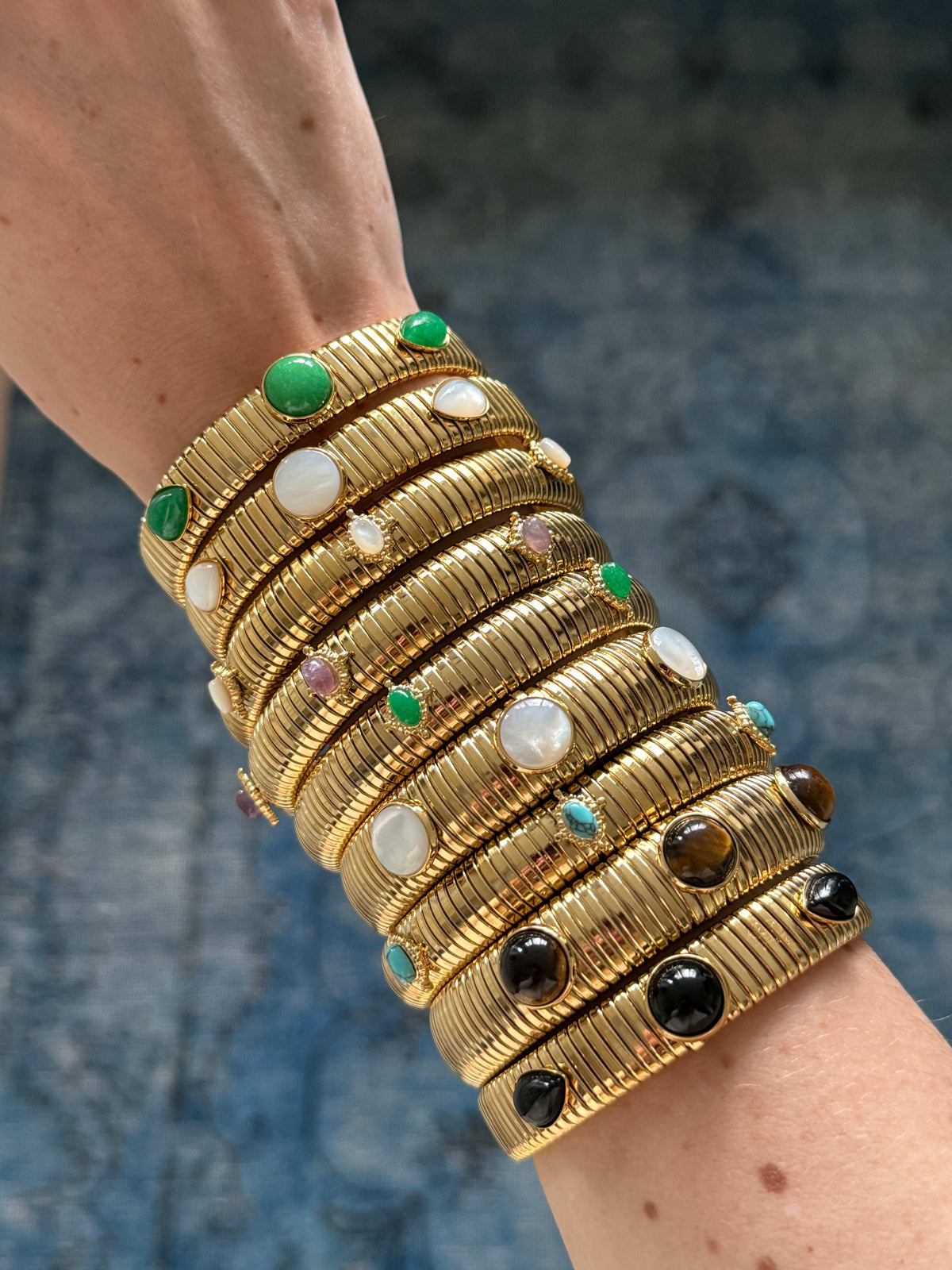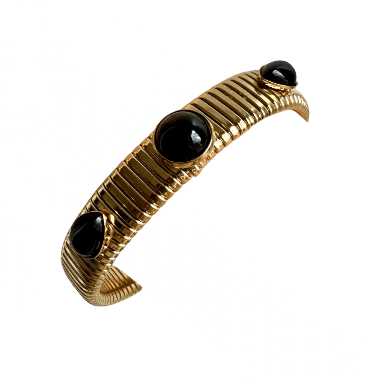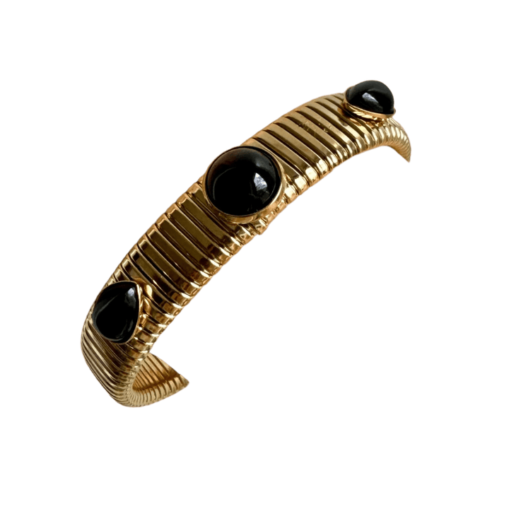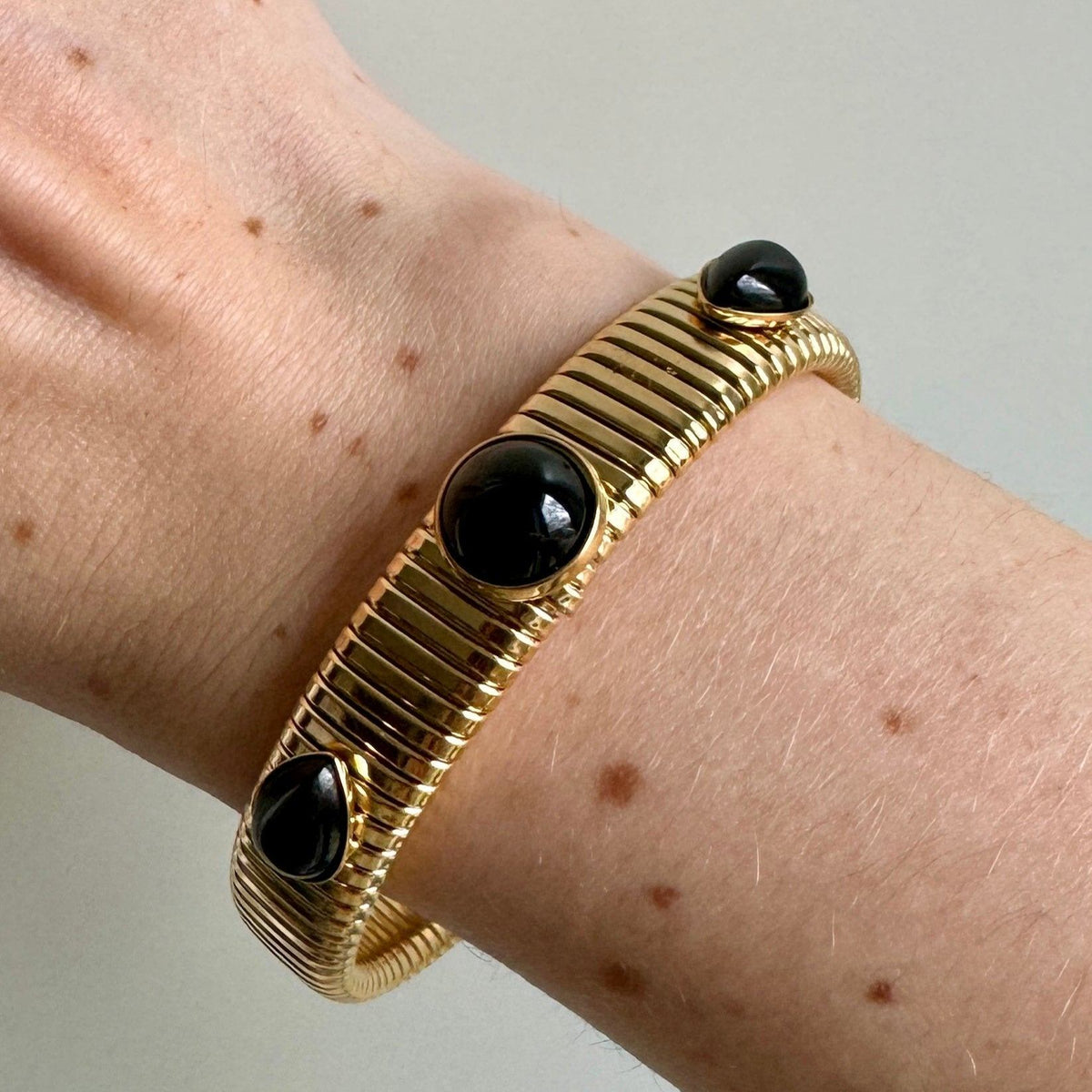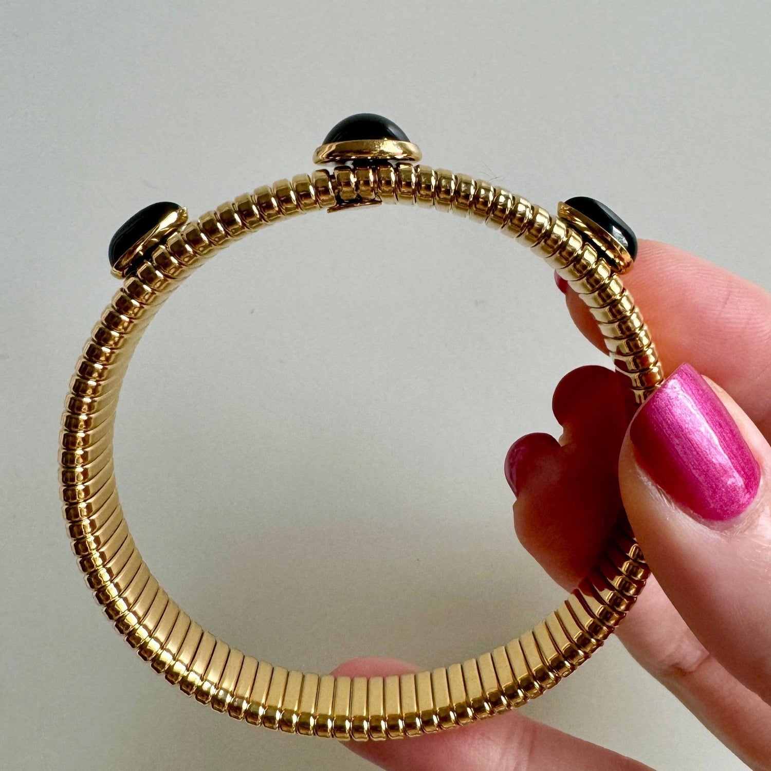 This bracelet is made of stretchy gold plate with glossy black onyx stones.