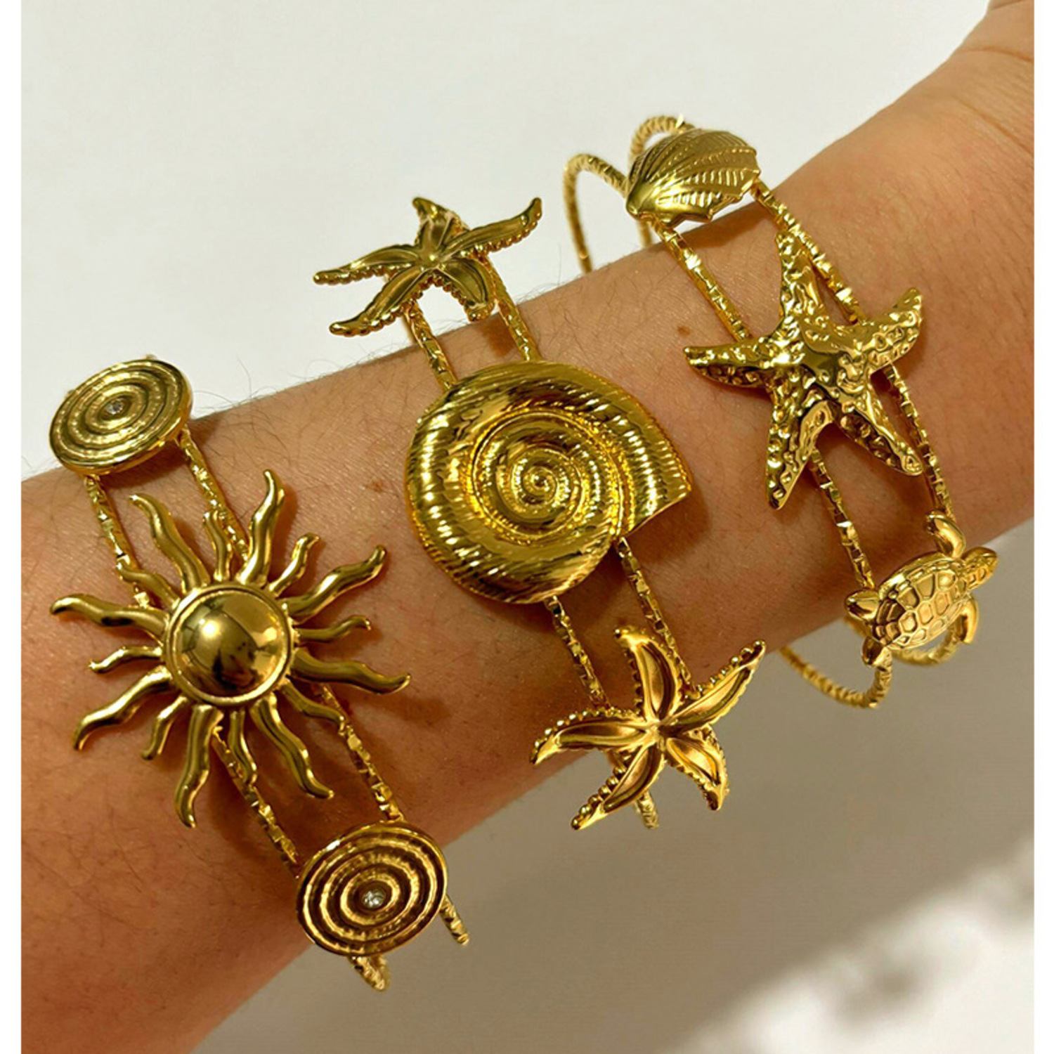 This bangle is a gold-toned metal with marine-inspired patterns.