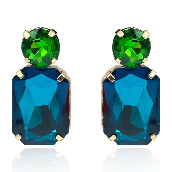 Peacock Blue Crystal Ocatgon And Green Tourmaline Round Stone Drop Earrings