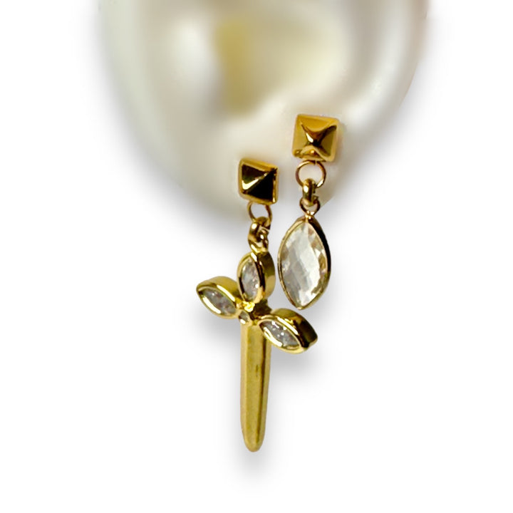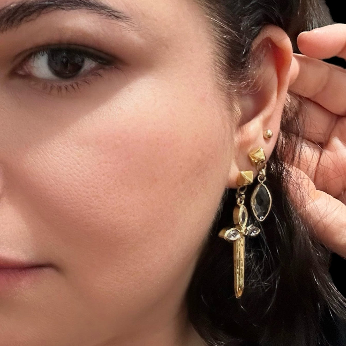 These Karma Mismatched Dagger Earrings by Jagged Halo Jewelry are a rebellious twist on timeless drop earrings, uneven on purpose and fierce by design. One side features a sleek dagger, while the other showcases a diamond-shaped evil eye charm. Together, they create a striking, mismatched pair that celebrates individuality and confidence. Lightweight yet impactful, they are perfect for the person who loves to stand out. These earrings channel an edgy elegance that works seamlessly from day to night, symbolizing bold self-expression and protection.