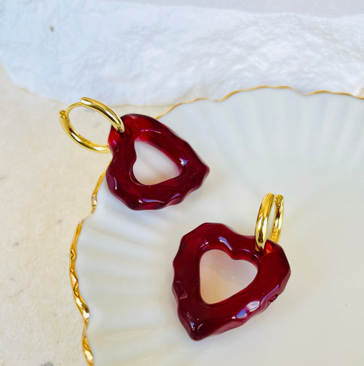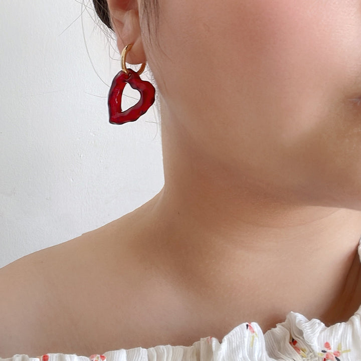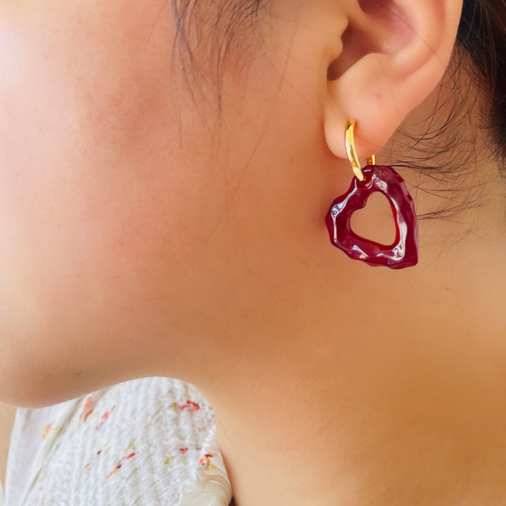 These hoop earrings are 18k gold-plated with 925 silver studs. They feature detachable red resin heart drops. The hoops are nickel-free.