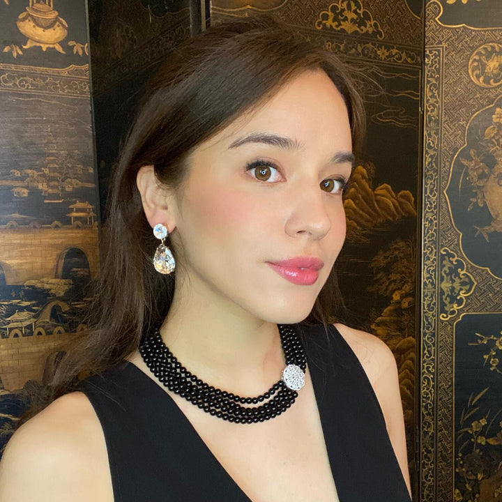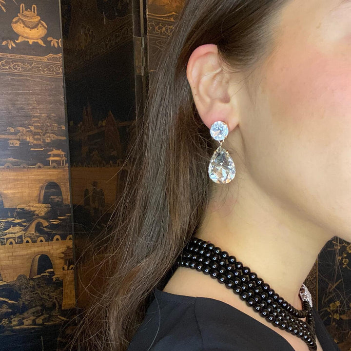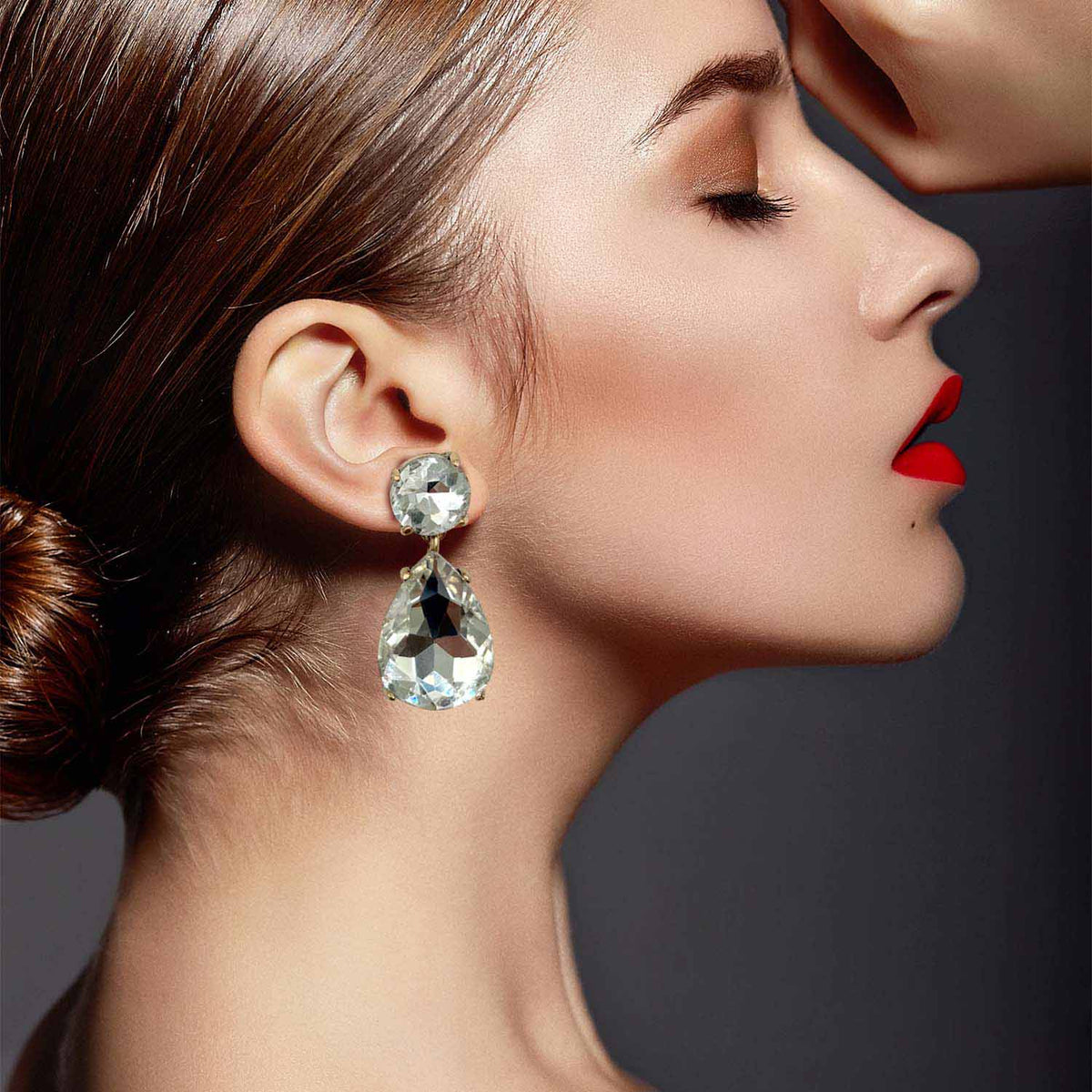 These Large Pear-Faceted Crystal Drop Earrings by Michael Nash Jewelry are a classic balance of glamour and versatility. The oversized pear-shaped crystal sparkles with elegance, perfect for both day and evening looks. Understated yet impactful, they bring instant sophistication to any ensemble.