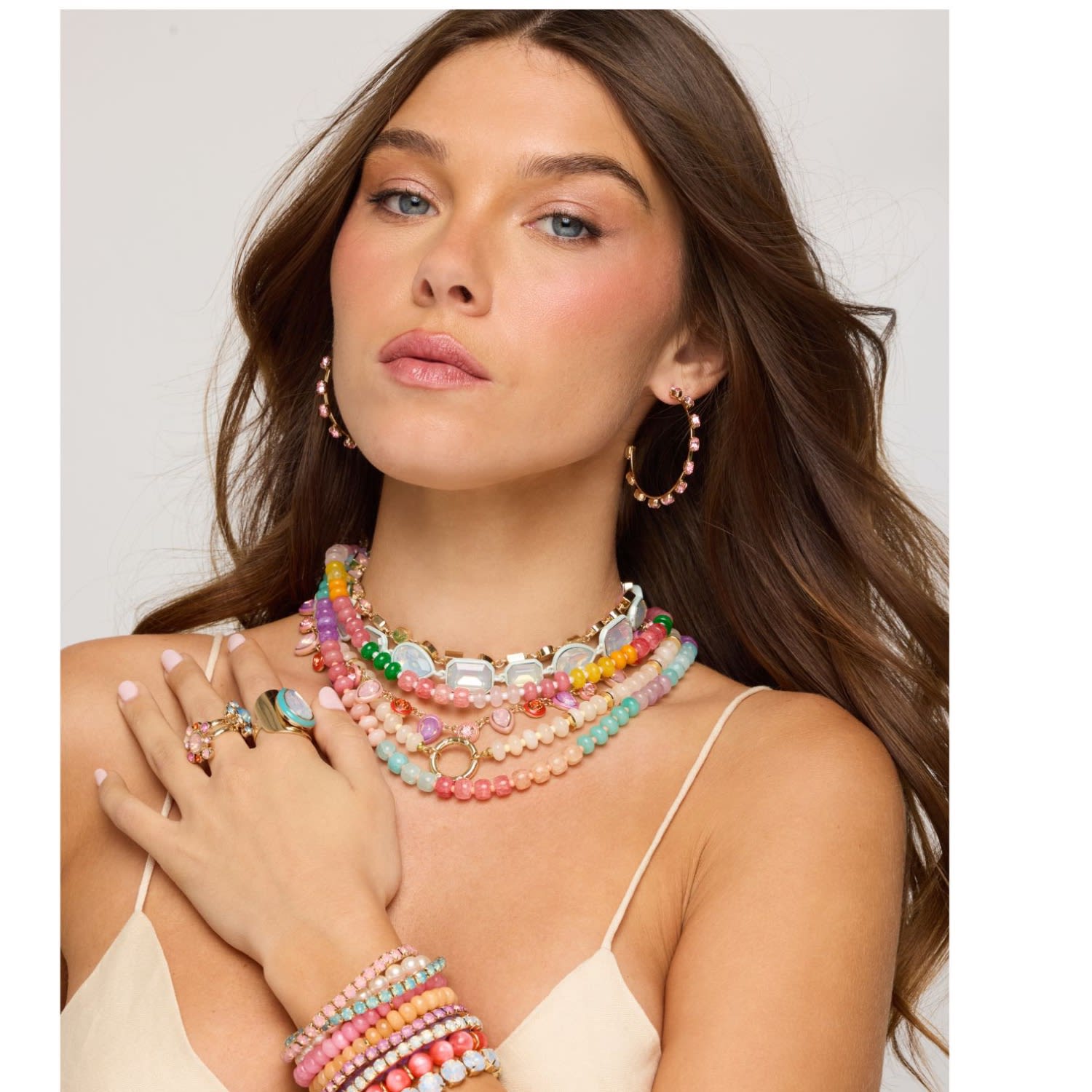 The Beaded Love Necklace in Soft Rainbow is a one-of-a-kind piece designed to spread love. The necklace features beautiful natural stone beads in a soft rainbow palette, adding a touch of natural beauty and a unique pop of color to any outfit.