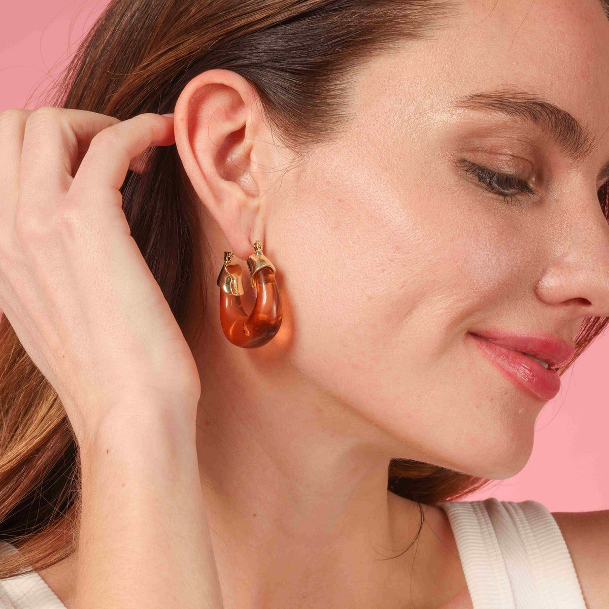 These hoop earrings are made of topaz resin and gold. They are lightweight and have a modern design.