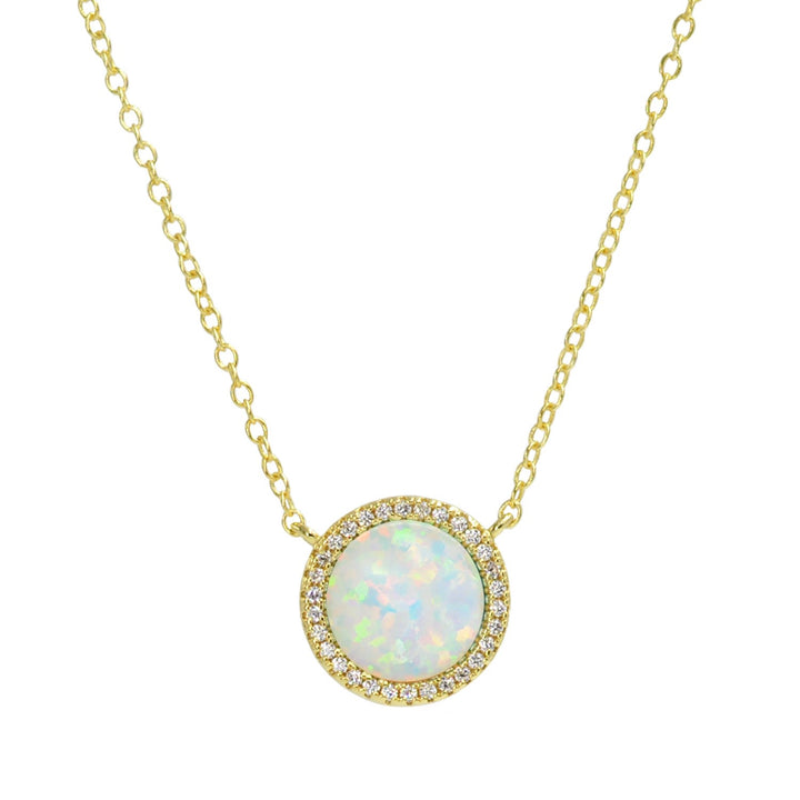 Lab-created white opal surrounded by crystals. 925 sterling silver with gold plating. Adjustable chain length up to 46cm with slider ball.