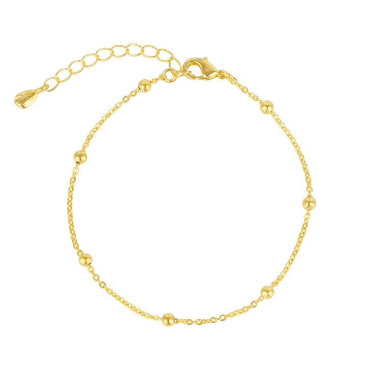 This Beaded Satellite Gold Chain Bracelet by Mejoma is a must-have accessory for any occasion. The delicate beaded design and sleek gold chain create a sophisticated and sparkling look, perfect for adding a touch of elegance to your wrist. This bracelet is a beautiful symbol of refined style.