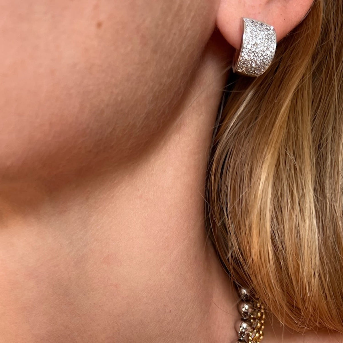 These earrings are made with hypoallergenic .925 sterling silver and sealed with a clear coat. They feature a cuff design and pave stones. They are lead-free and cadmium-free.