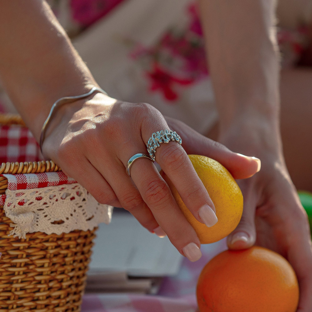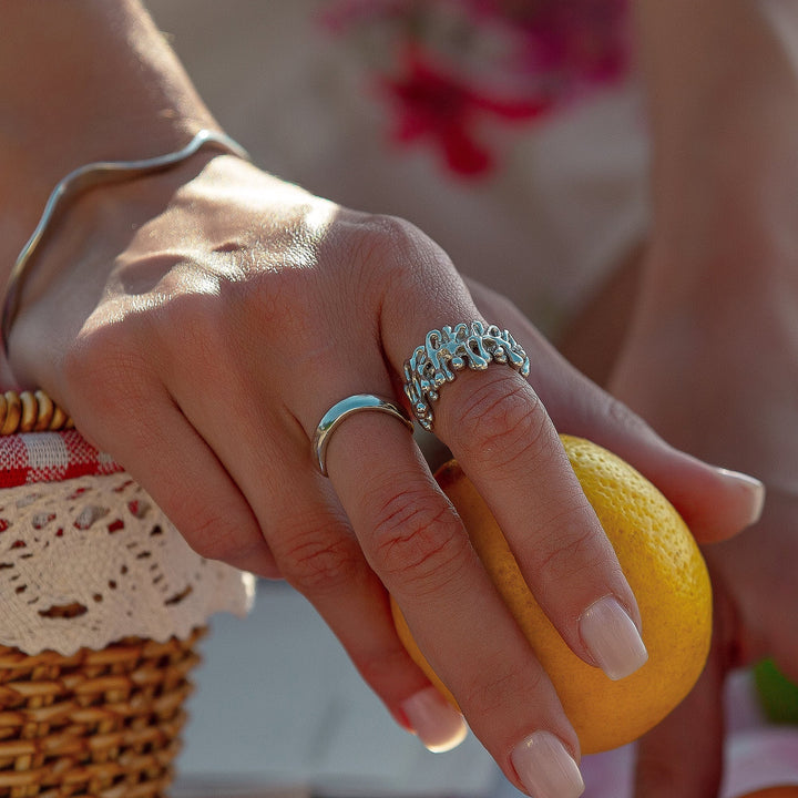 This Elegance Silver Wavy Ring by Mejoma is a unique and sophisticated accessory inspired by the fluidity of waves. The handcrafted wavy pattern adds a touch of charm and elegance to any outfit. This stunning ring is perfect for making a statement and adds a subtle, modern flair to your style.