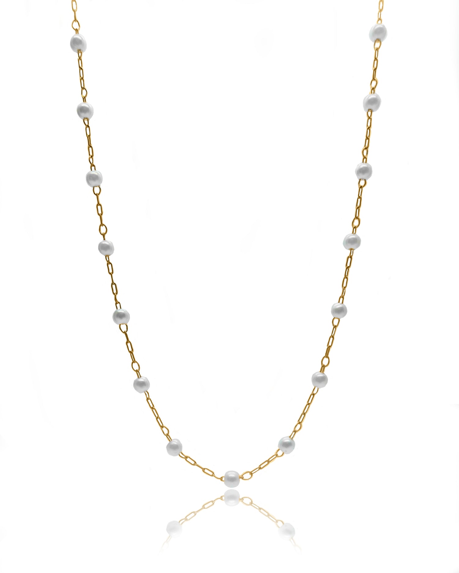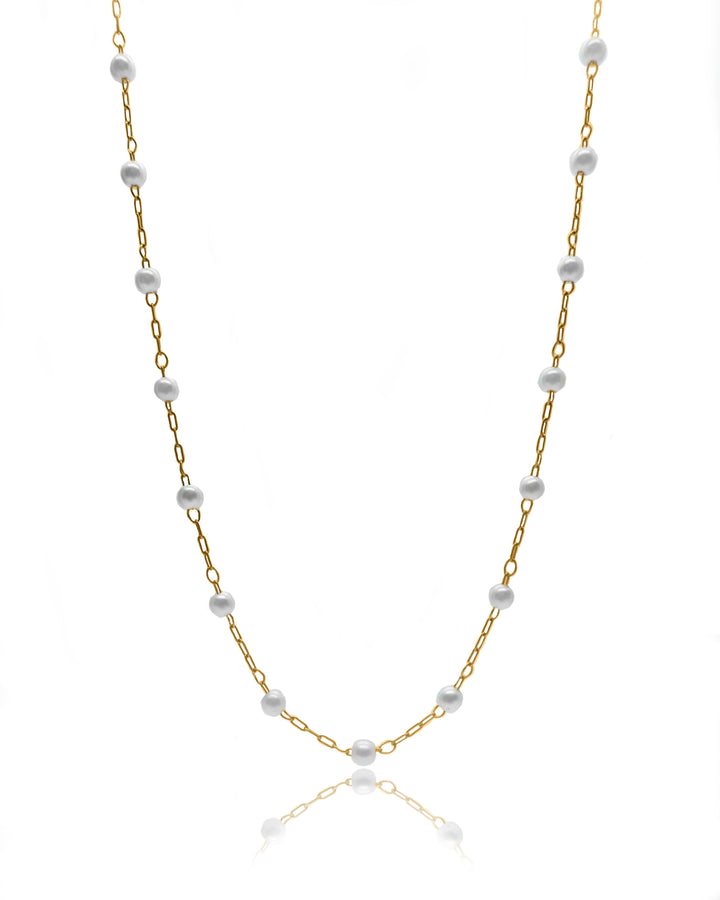 This necklace is made from high-quality 18k gold-coated stainless steel. It features synthetic pearls, an oval link chain, and a lobster clasp. It is hypoallergenic, waterproof, and non-tarnish.
