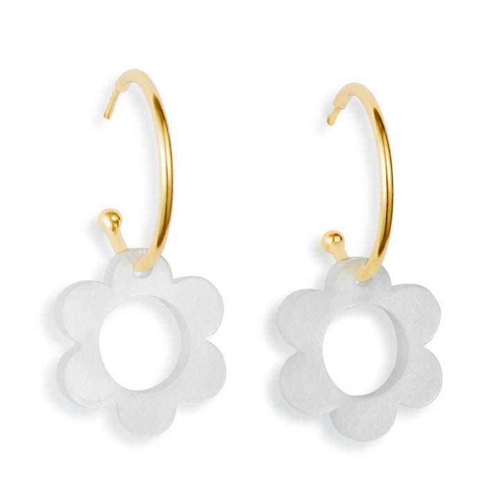 These earrings feature a white charming flower charm threaded onto an 18ct gold vermeil hoop. The specific material for the charm is not listed.