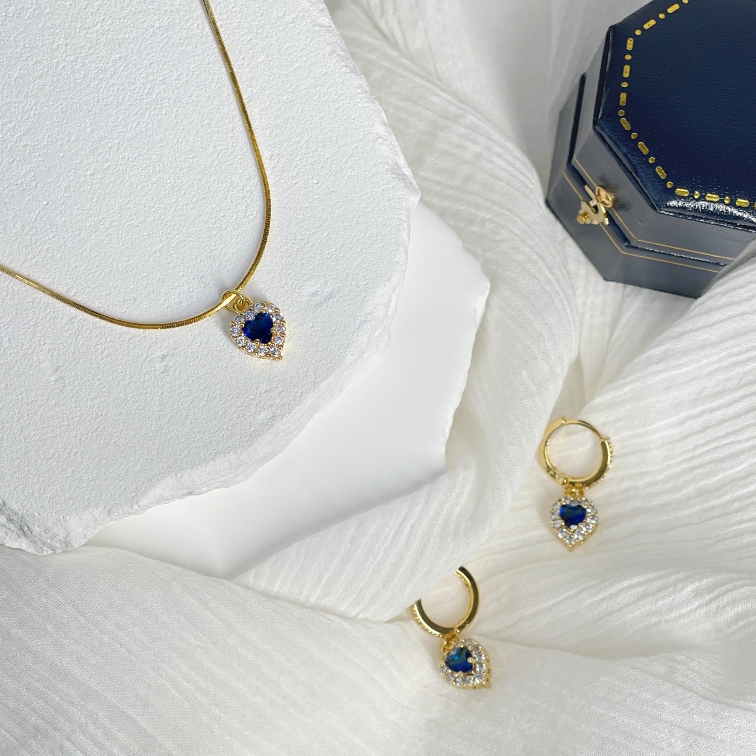These Celestial Heart Gems Earrings - Blue by Ninemoo are a romantic and ethereal accessory. They are a statement of love, eternity, and sincerity, inviting you to feel the endless tranquility of the universe. Each time you wear them, it's like gazing at the stars. Crafted from 925 silver and gold-plated brass, these earrings are adorned with sparkling zirconia stones, making every moment shine with celestial love.