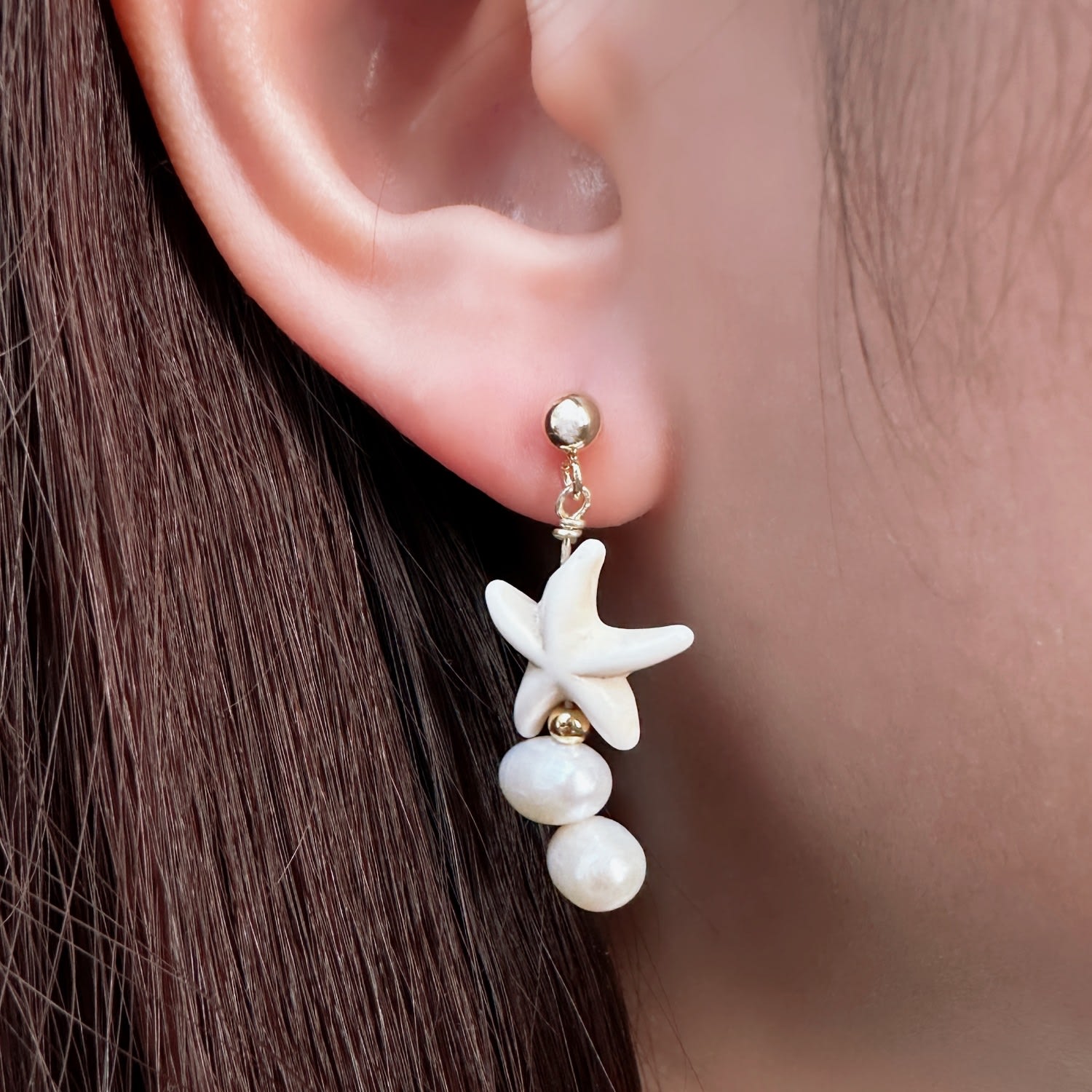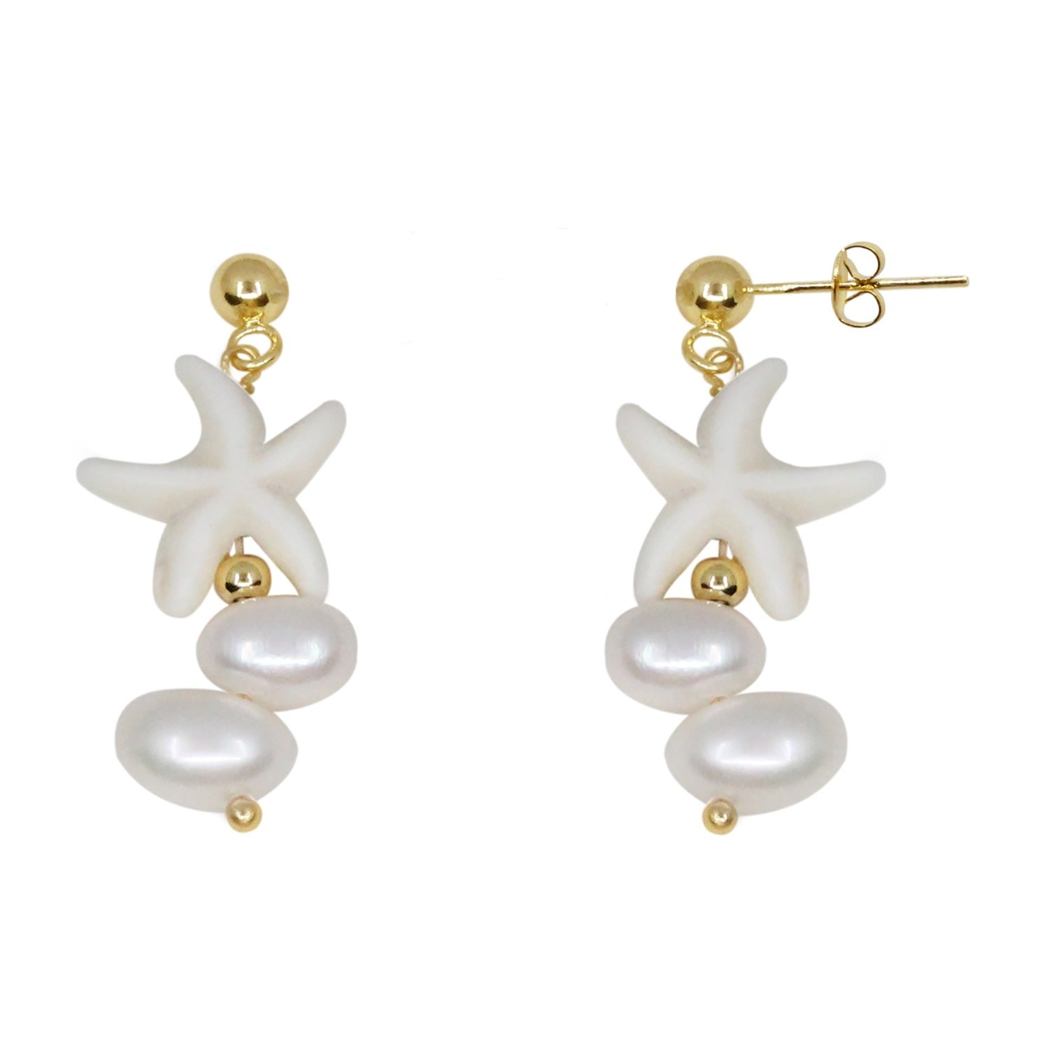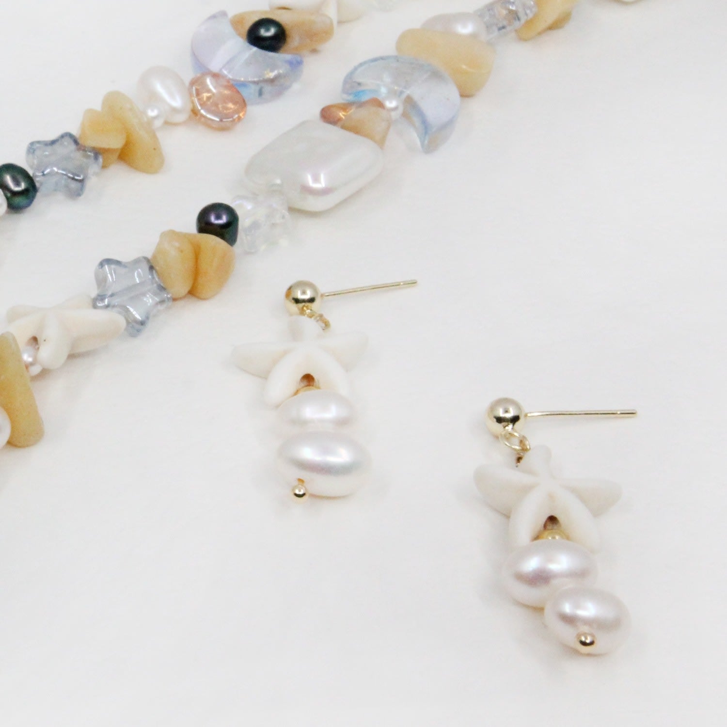 These earrings are made from a medley of pearls, crystals, and shells. The hardware is gold-plated brass and 925 silver.