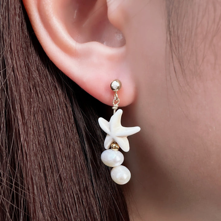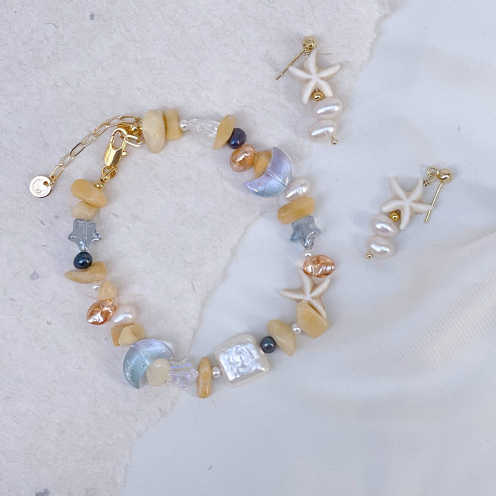 These Coastal Gem Medley Earrings by Ninemoo are an enchanting accessory. Inspired by the French Mediterranean coast, they are composed of pearls, crystals, and shells. The materials are sourced from natural elements.