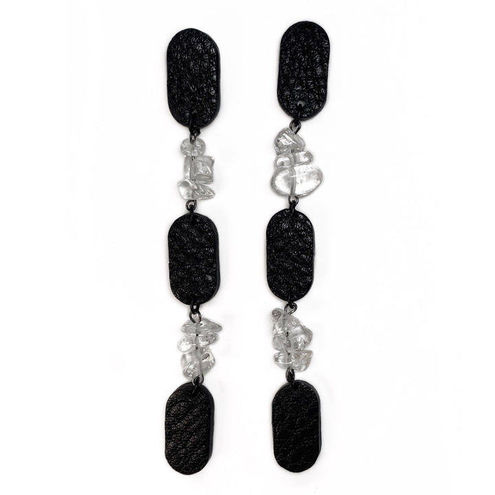 Genuine leather, clear quartz crystals, and hypoallergenic stainless steel posts. Includes a recyclable storage pouch.