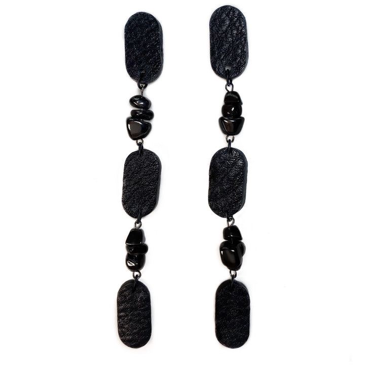 These dangle earrings feature capsule-shaped hematite crystals. The metals are not specified, but the product description mentions a clean, modern style. They are a single pair.