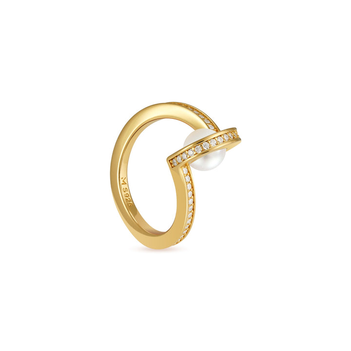 This Pearl And Arc Ring - Rose Gold by Meulien captures celestial inspiration in jewelry form. A freshwater pearl is framed by a graceful arc, echoing the glow of a star and its halo. The band’s square edges are paved with sparkling CZ stones, creating a sculptural, minimalist design that feels both modern and timeless. A ring that radiates elegance with subtle drama.