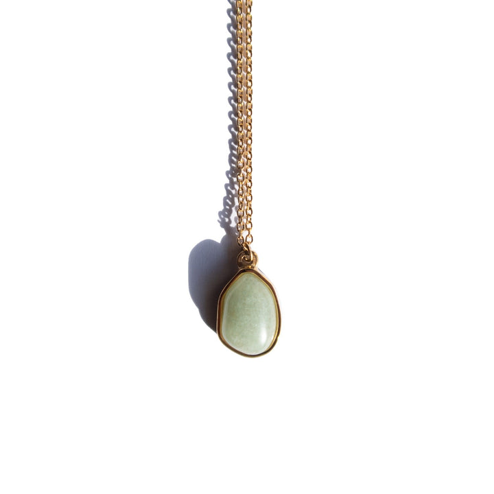 This Puzzle Jade Stone Pendant Necklace Pebble by Seree features a soft aventurine pendant carved and polished by hand, lending each piece a unique character. With its fresh green hue and delicate chain, it brings calmness and everyday elegance, celebrating the individuality of natural stone.