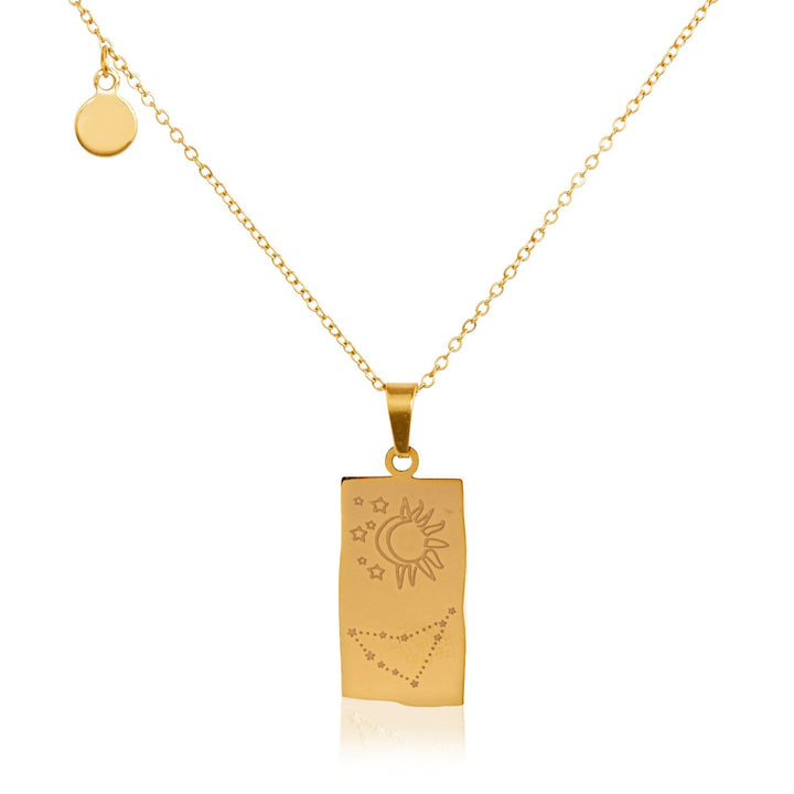 This necklace is crafted from 18ct gold-plated 316 stainless steel and features a double-faced tarot card-inspired design with a zodiac illustration and its constellation. It comes with a 12-month guarantee.