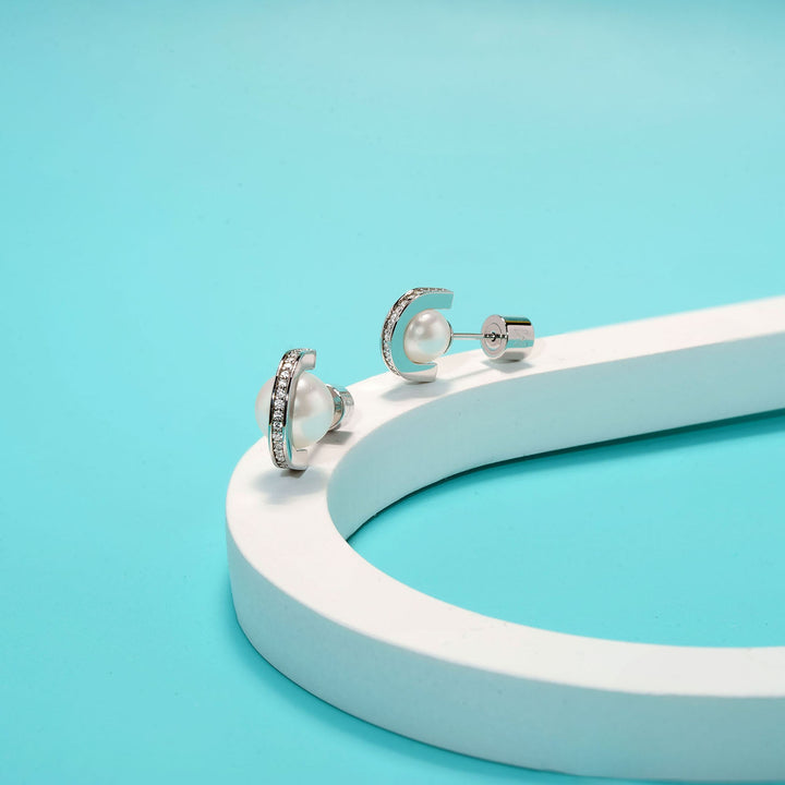 Pearl And Arc Stud Earrings - Silver, Six Millimeter Pearl
