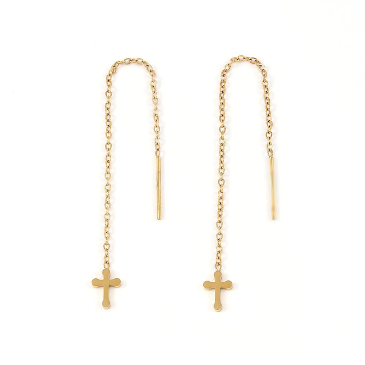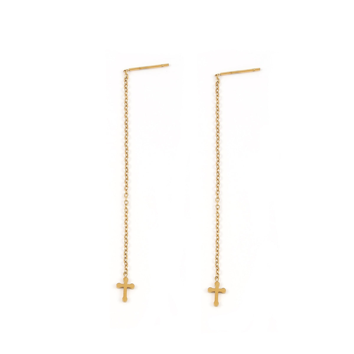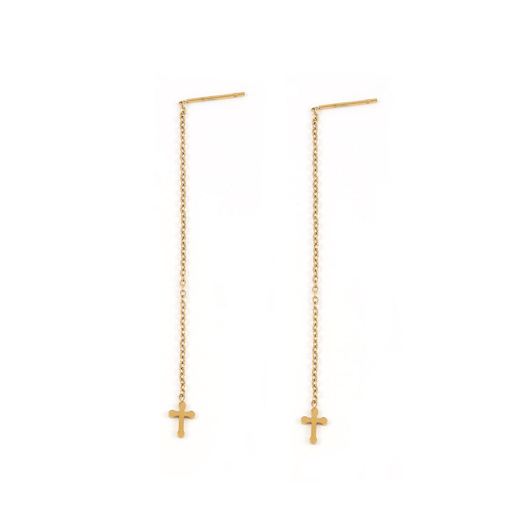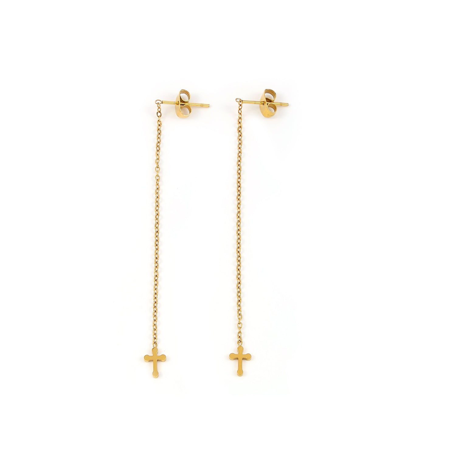These earrings are made from stainless steel. The cross charm measures 7.5x5 mm and the chain length is 65mm. They are sold as a pair.