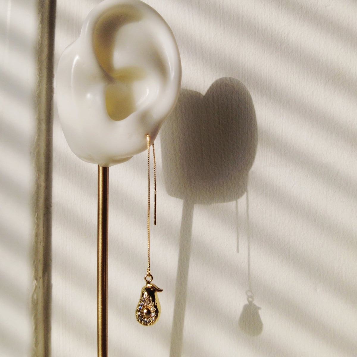 These threader earrings are made from 18k gold-plated brass and 925 silver. They are set with sparkling cubic zirconia in a fruit shape.