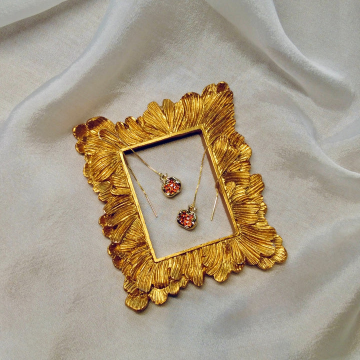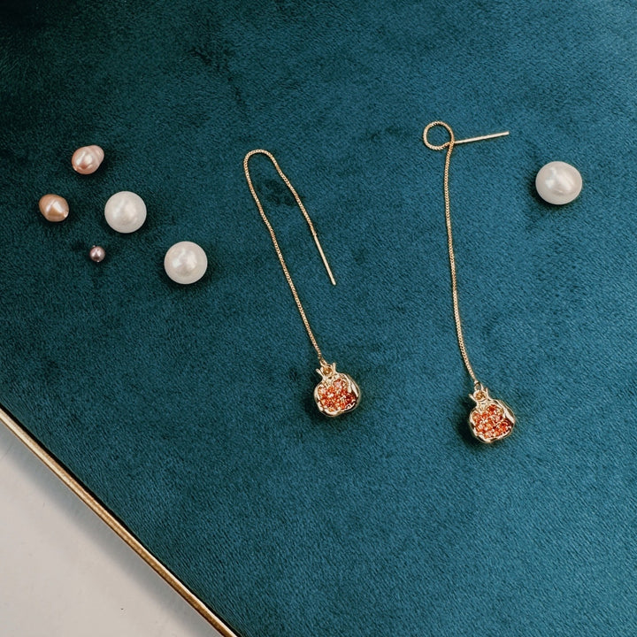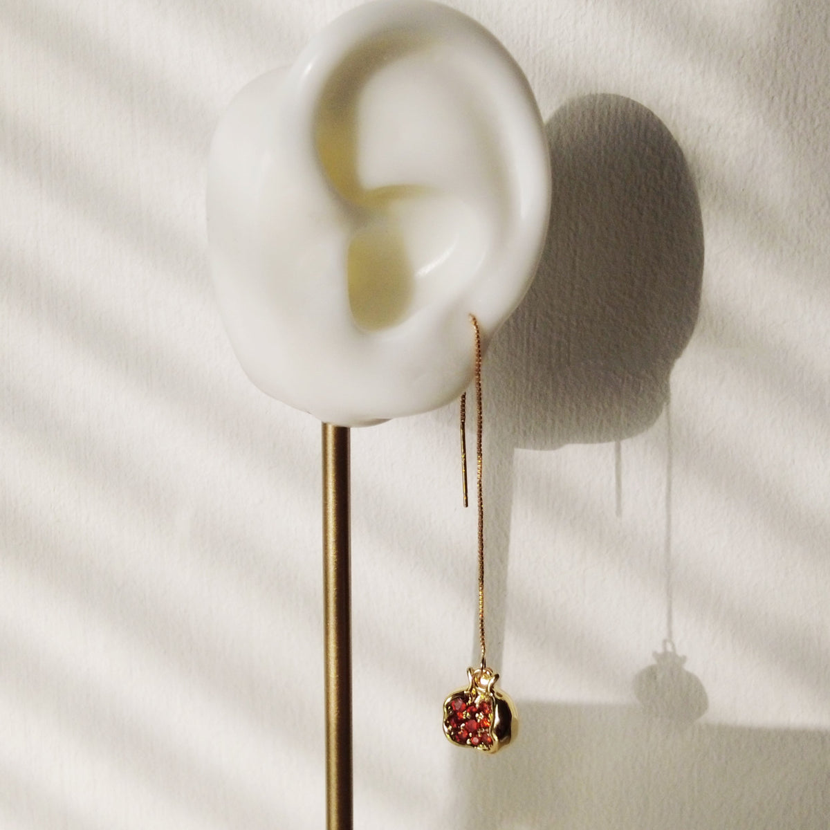 These Fruit Threader Earrings by Ninemoo are a whimsical and delightful accessory that adds a playful sparkle to your everyday look. They feature a delectable arrangement of cubic zirconia in a charming fruit shape, creating a fun and eye-catching design. The threader style adds a modern and elegant touch, allowing the earrings to sway gracefully with every movement. These earrings symbolize a lighthearted and joyful style, making them a fun and charming accessory for those who love to express their personality through their jewelry.
