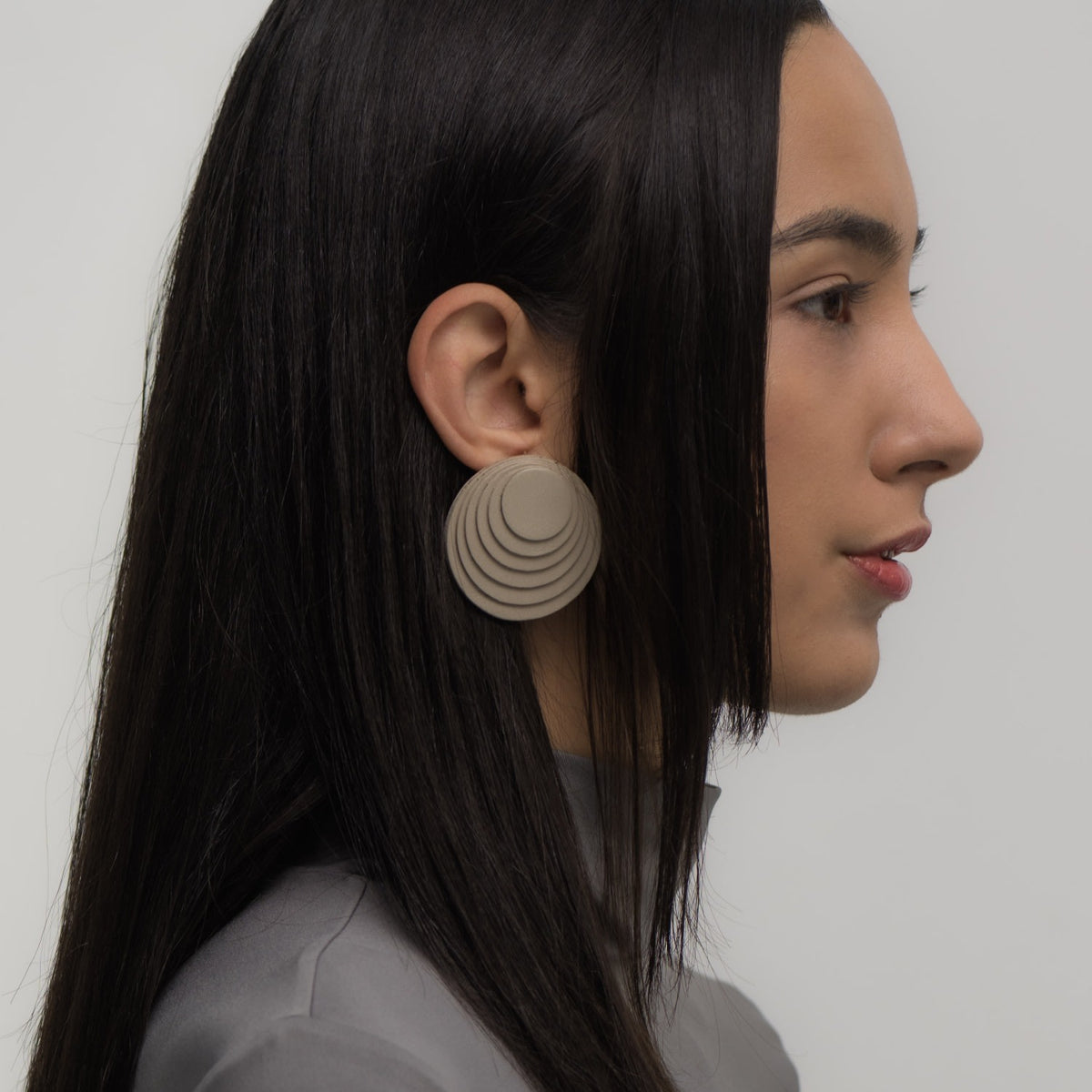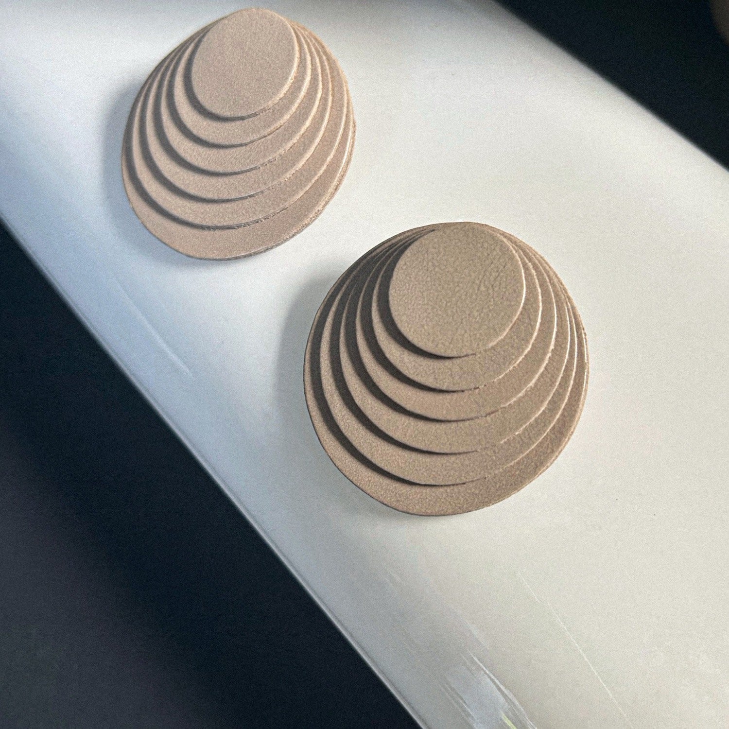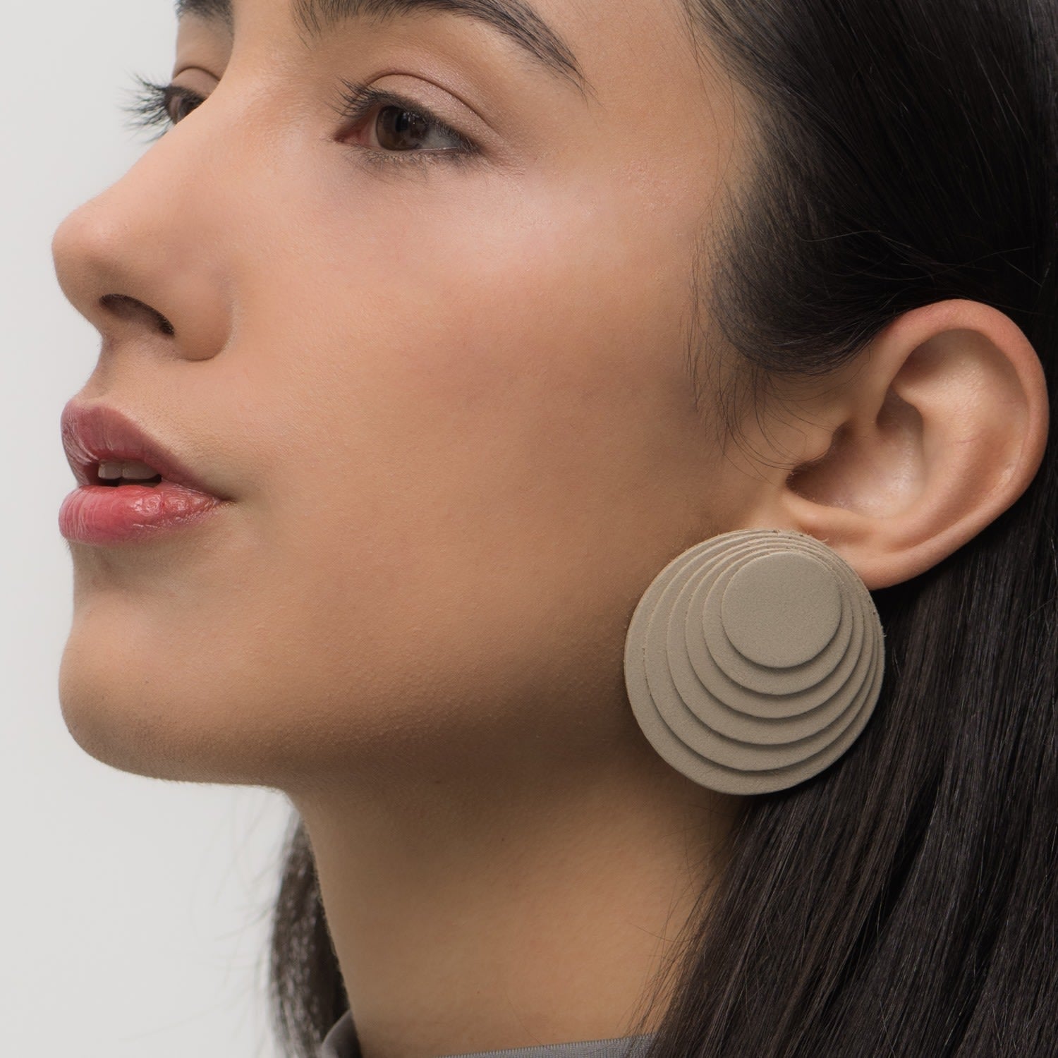 These Layered Leather Studs Taupe by Waiwai embody sculptural artistry in wearable form. Hand-cut taupe leather circles are stacked in concentric layers to create a textured, dimensional design. Minimalist yet bold, these lightweight studs balance contemporary style with everyday ease, making them an understated statement piece.