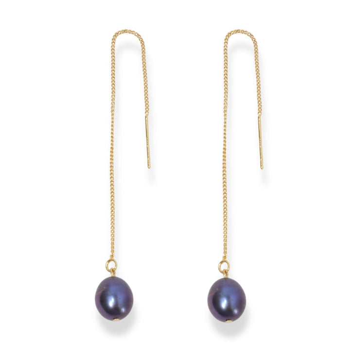 These earrings are made of Gold-Filled / Stainless Steel and feature natural black baroque pearls. They are a threader style.