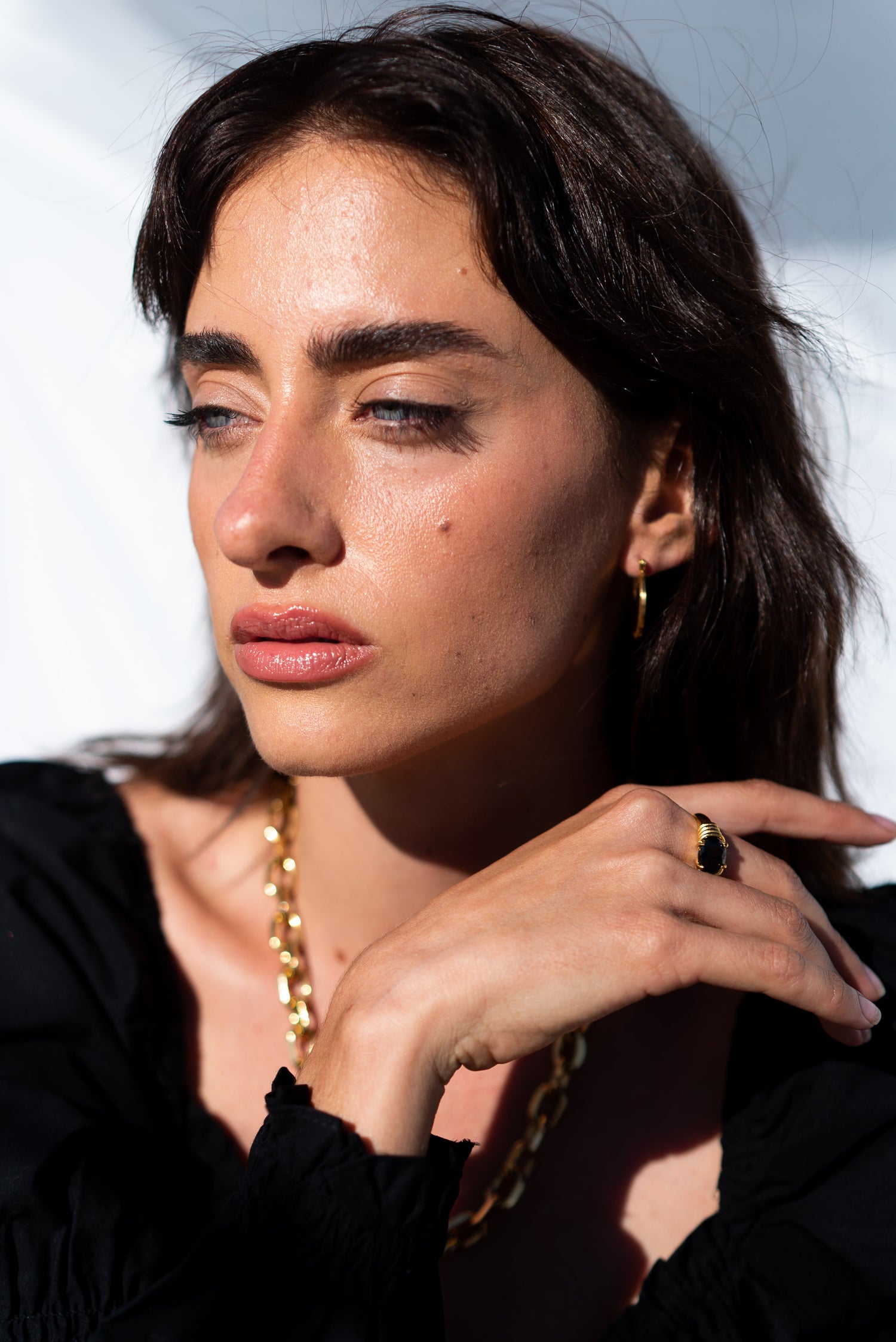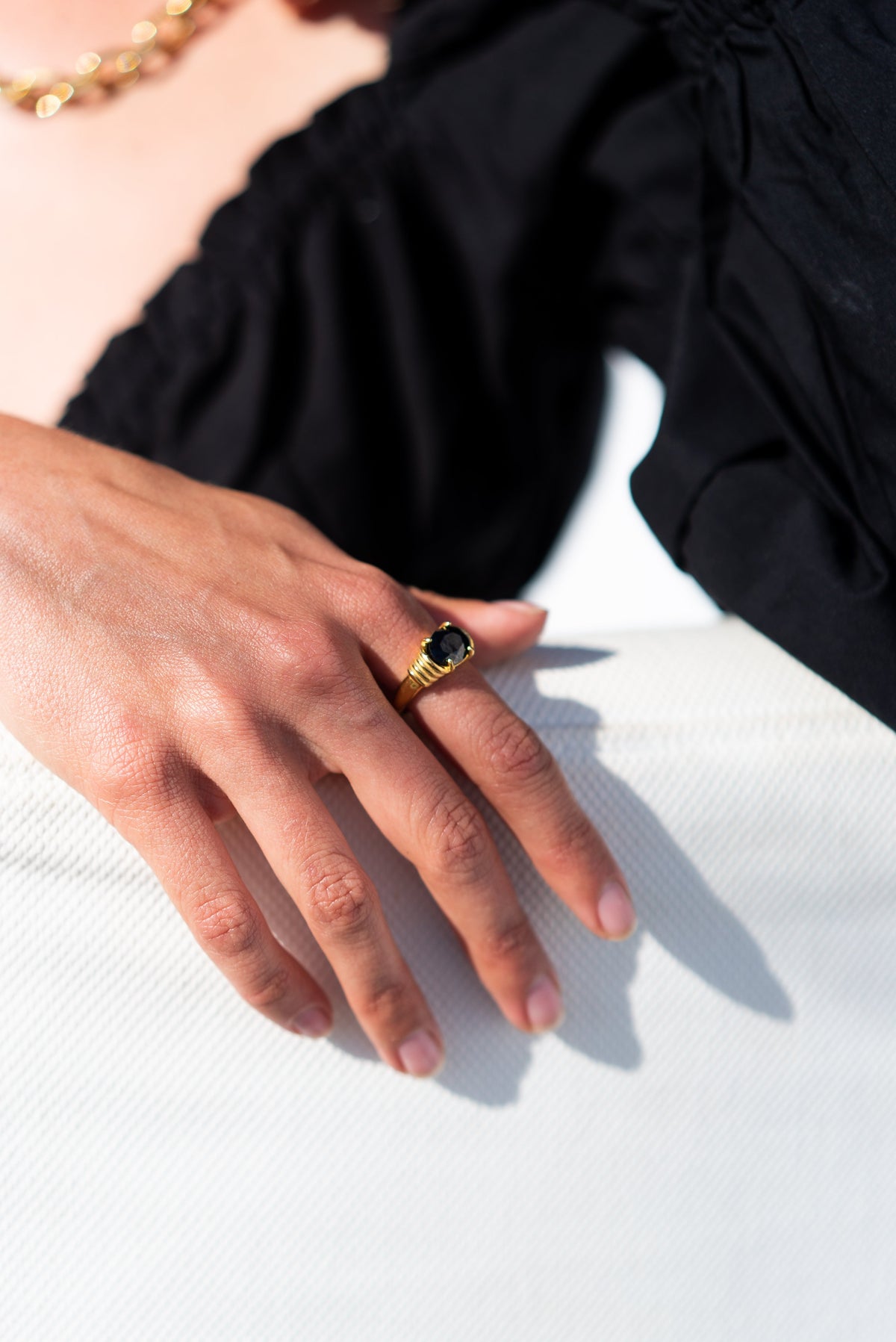 This Ease Ring - Black by Tseatjewelry is a gorgeous and unique statement piece. The captivating black-hued stone finish creates a mesmerizing effect with its rich, vibrant colors and beautiful shine. This ring is a wearable work of art that effortlessly adds a touch of bohemian luxury and personality to your hand.