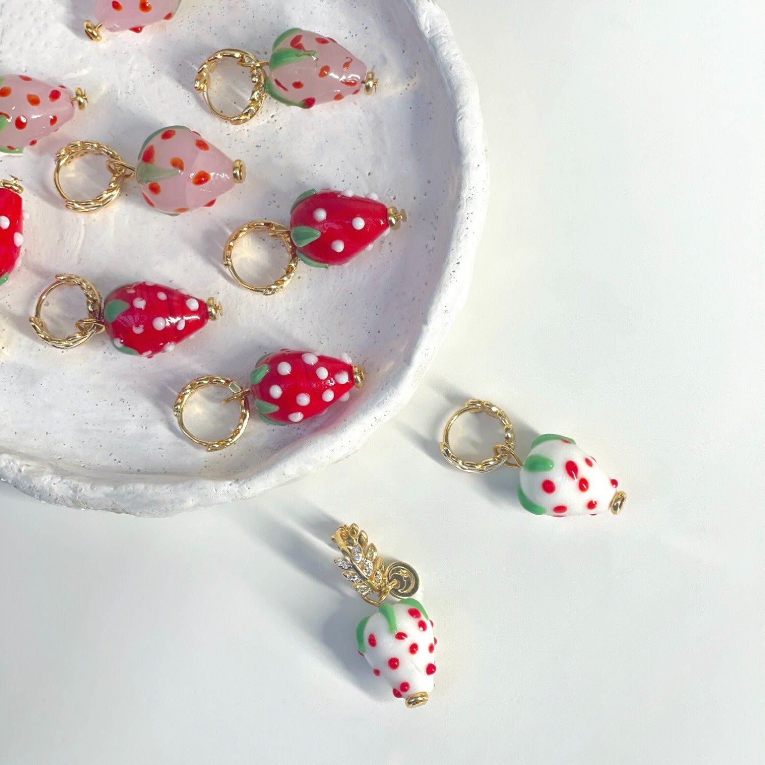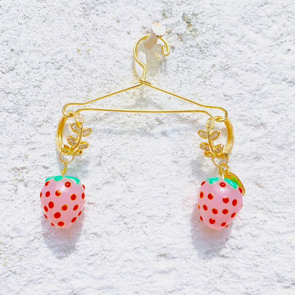 These Strawberry Hoops Earring - Pink & Purple by Ninemoo are a delicate and sweet accessory for your beautiful summer look. The design features small sweet strawberries and Snow White strawberries hung under gold-plated zircon leaf-shaped hoops. They move slightly with your movement, like ripening fruit swaying in the breeze, adding color and sweetness to your ears.