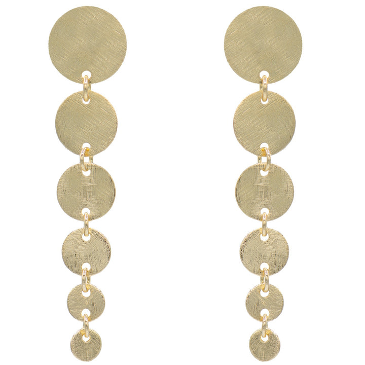 These earrings are handcrafted in Brazil from 18k gold plated brushed metal. They feature circles that cascade down, getting smaller.