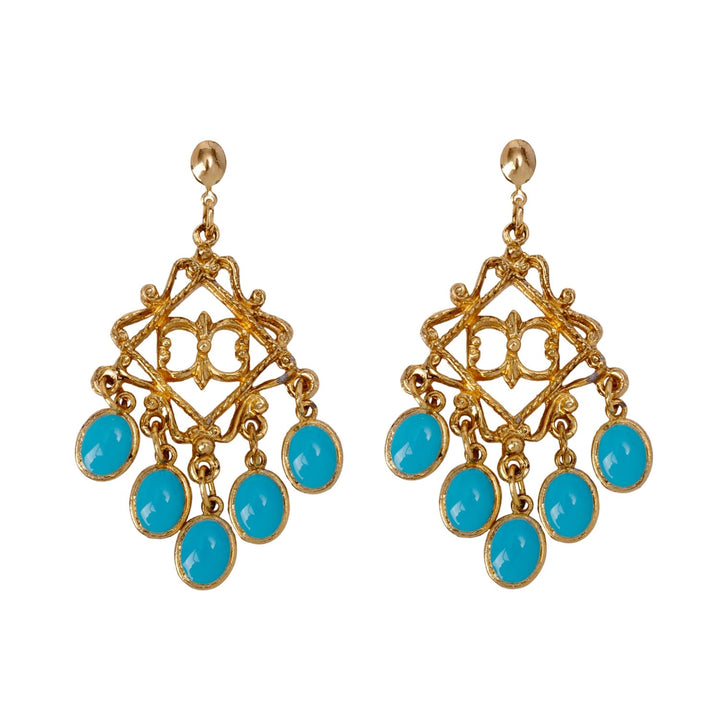 These earrings are vintage and feature an 18ct gold-plated finish on an unspecified metal. The design includes intricate filigree details and six vibrant turquoise cabochons.