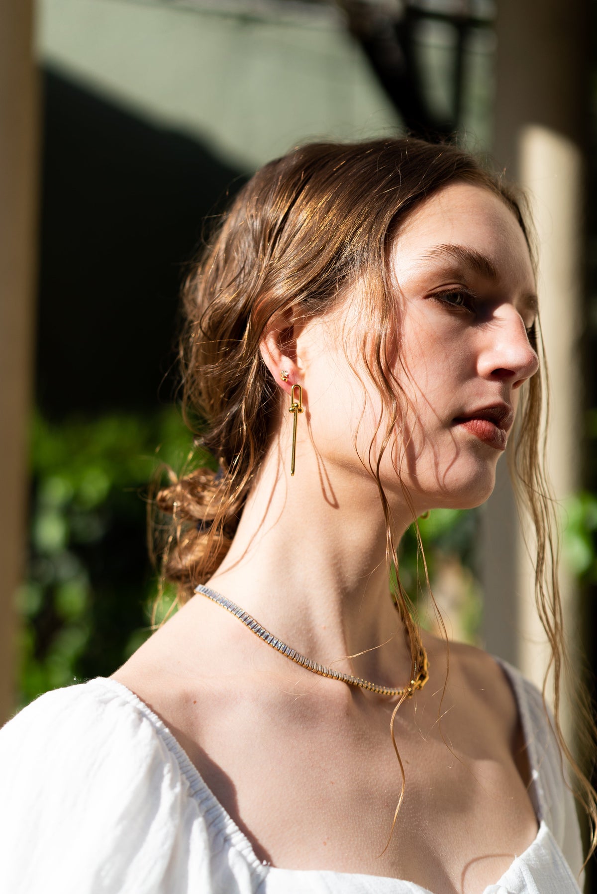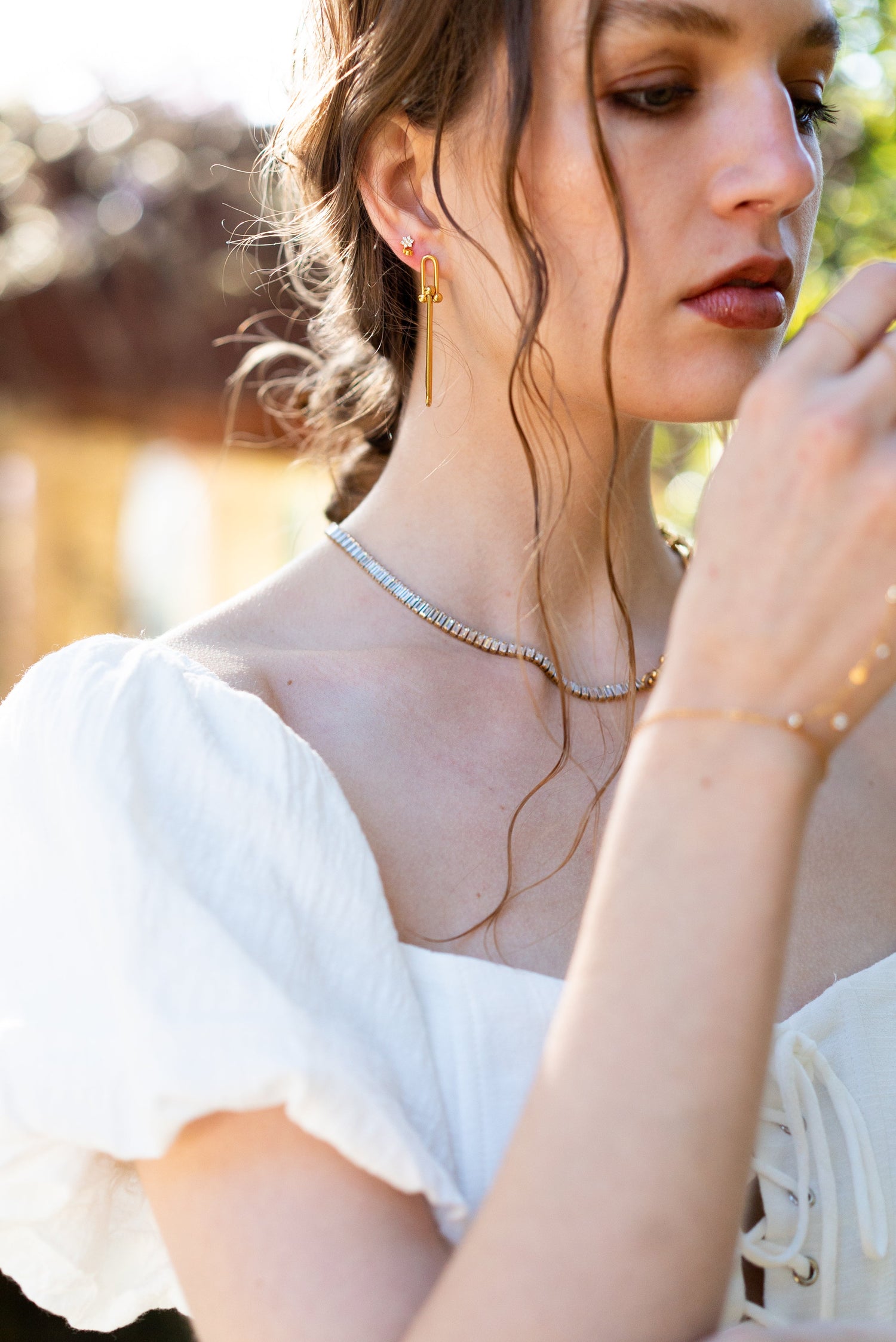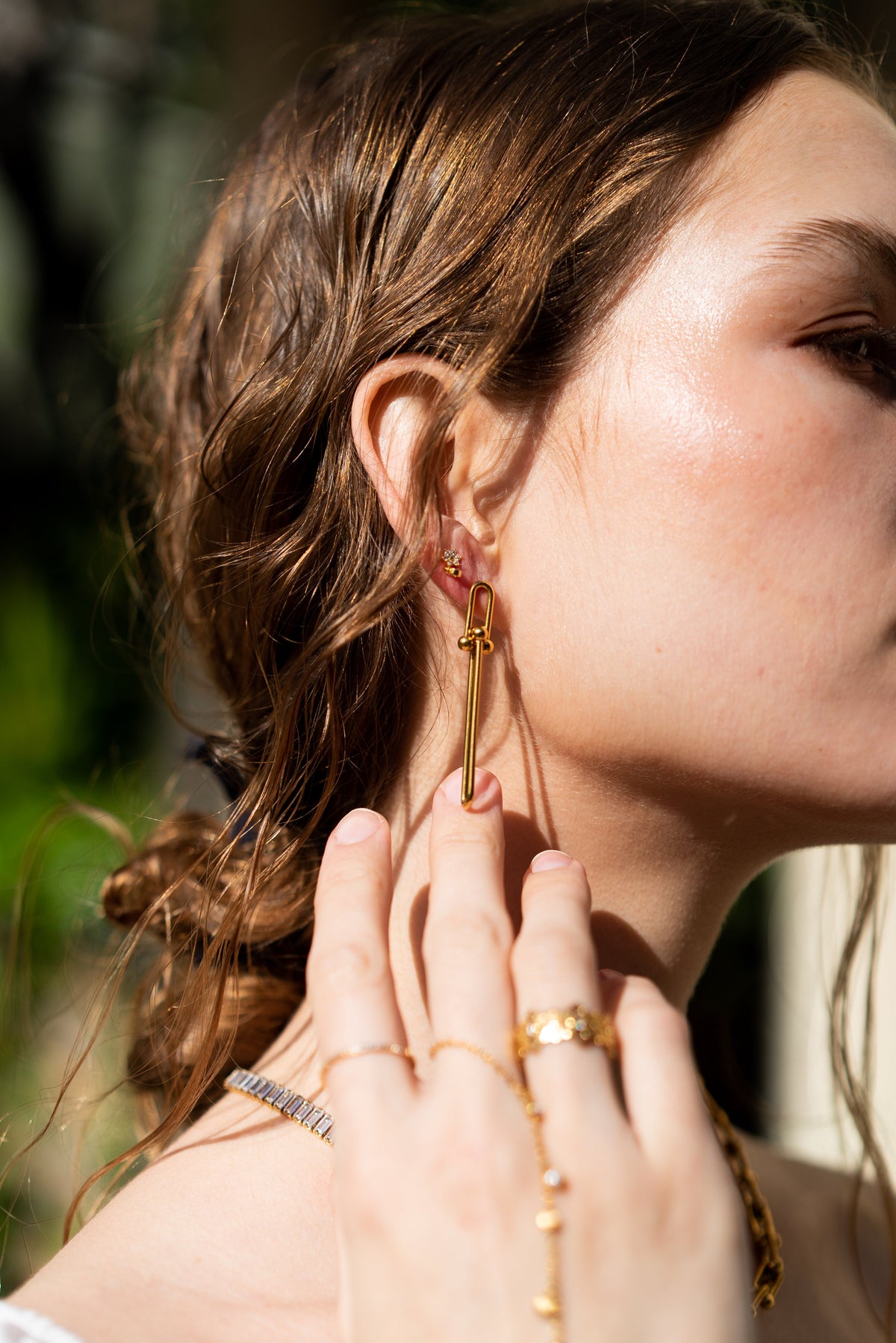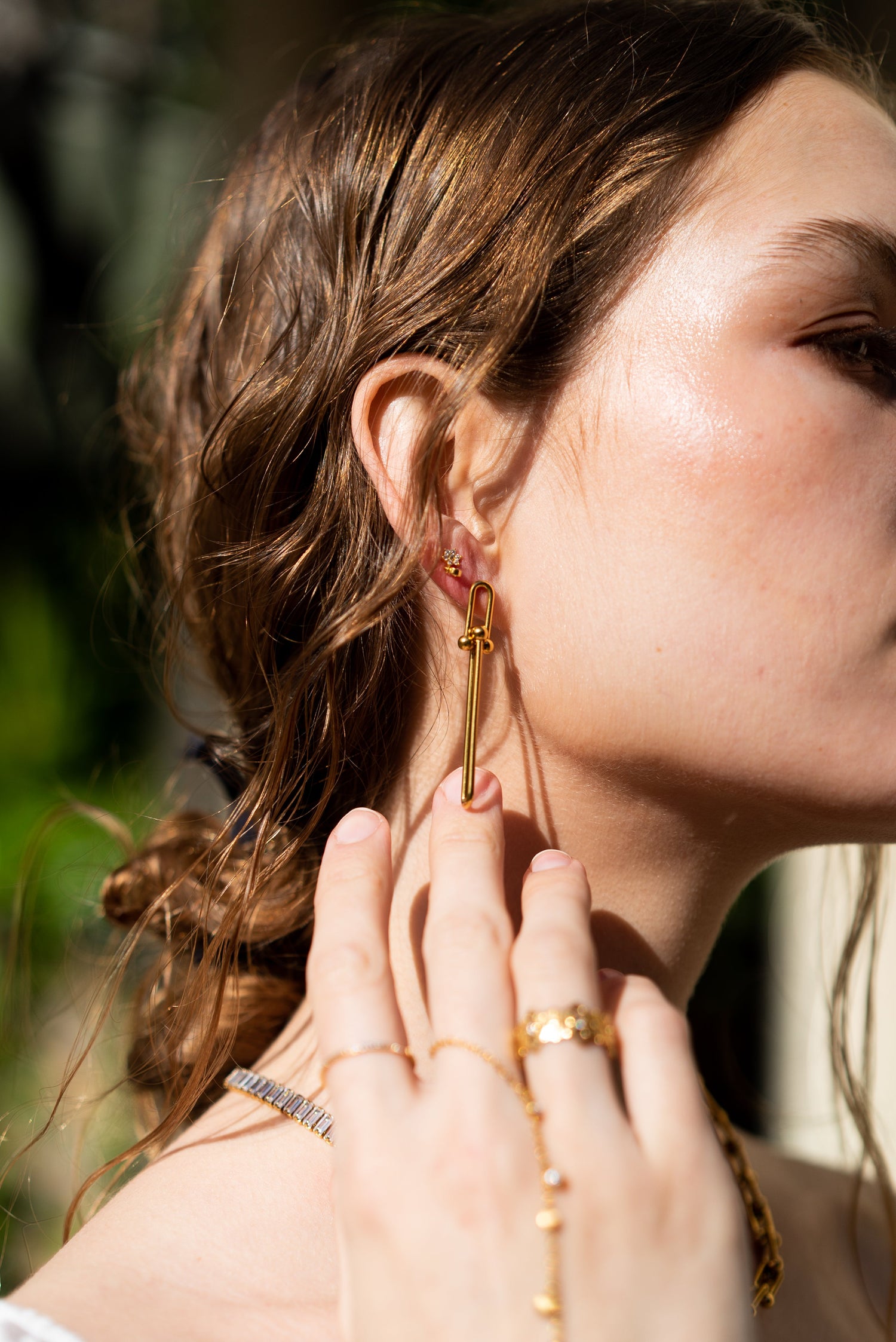 These Zen Earrings by Tseatjewelry are a sleek and modern accessory designed to add a touch of class to any formal outfit. Their clean lines and polished gold finish create a sophisticated and minimalist aesthetic, symbolizing calm and refined elegance. These earrings are perfect for a look that is both timeless and chic.
