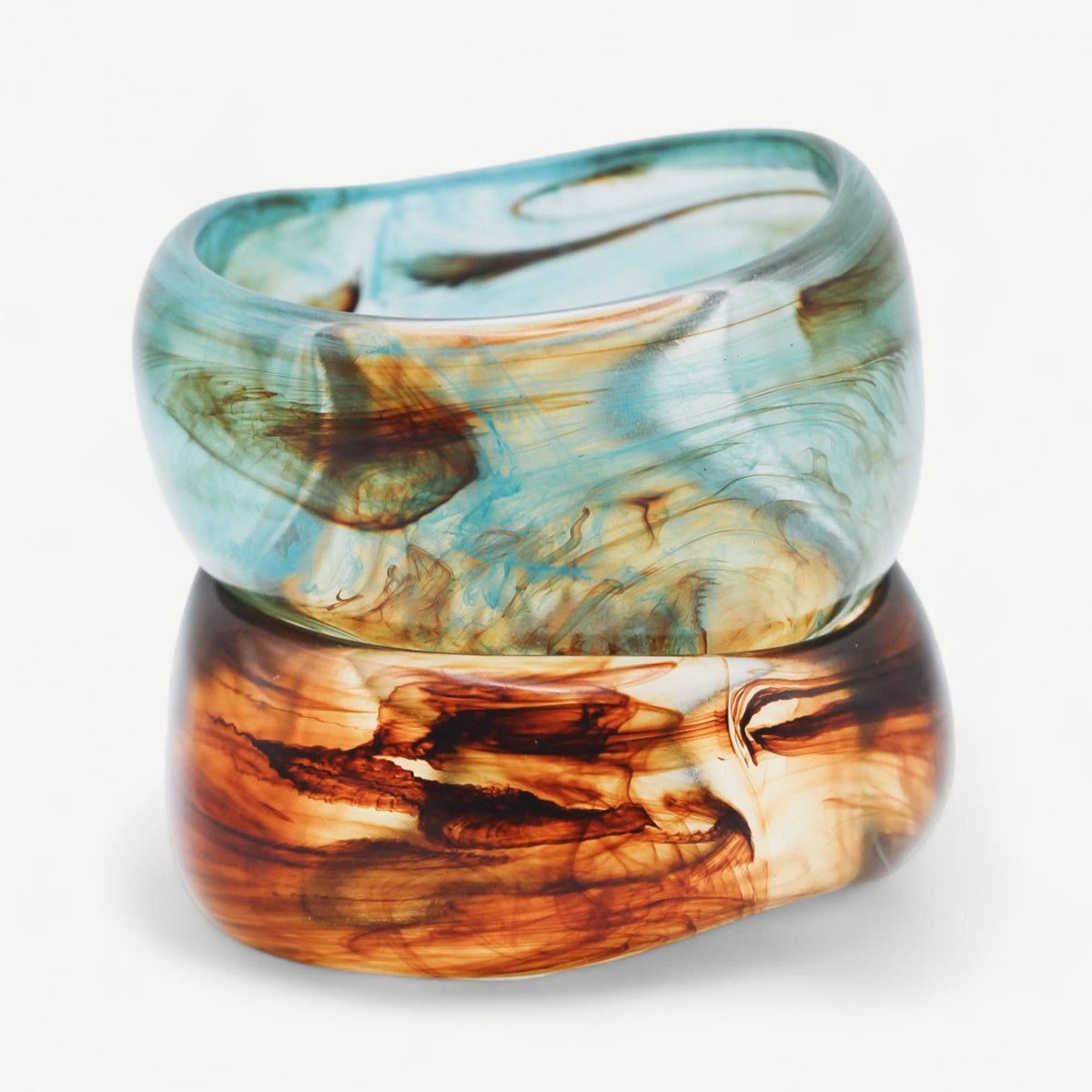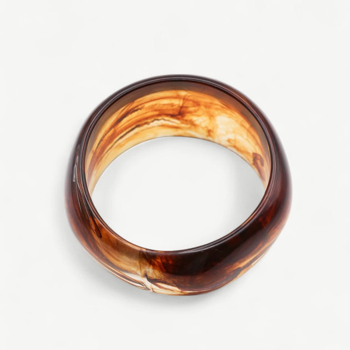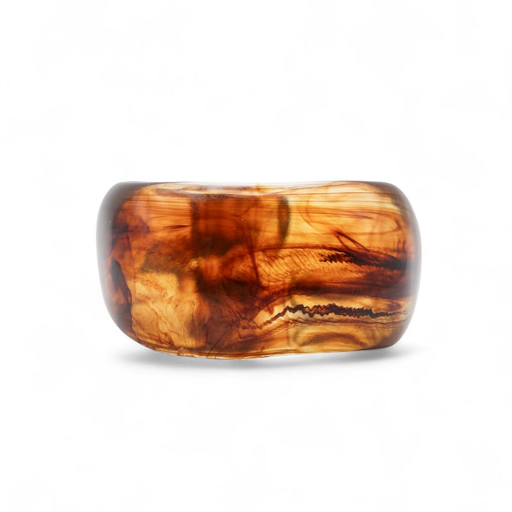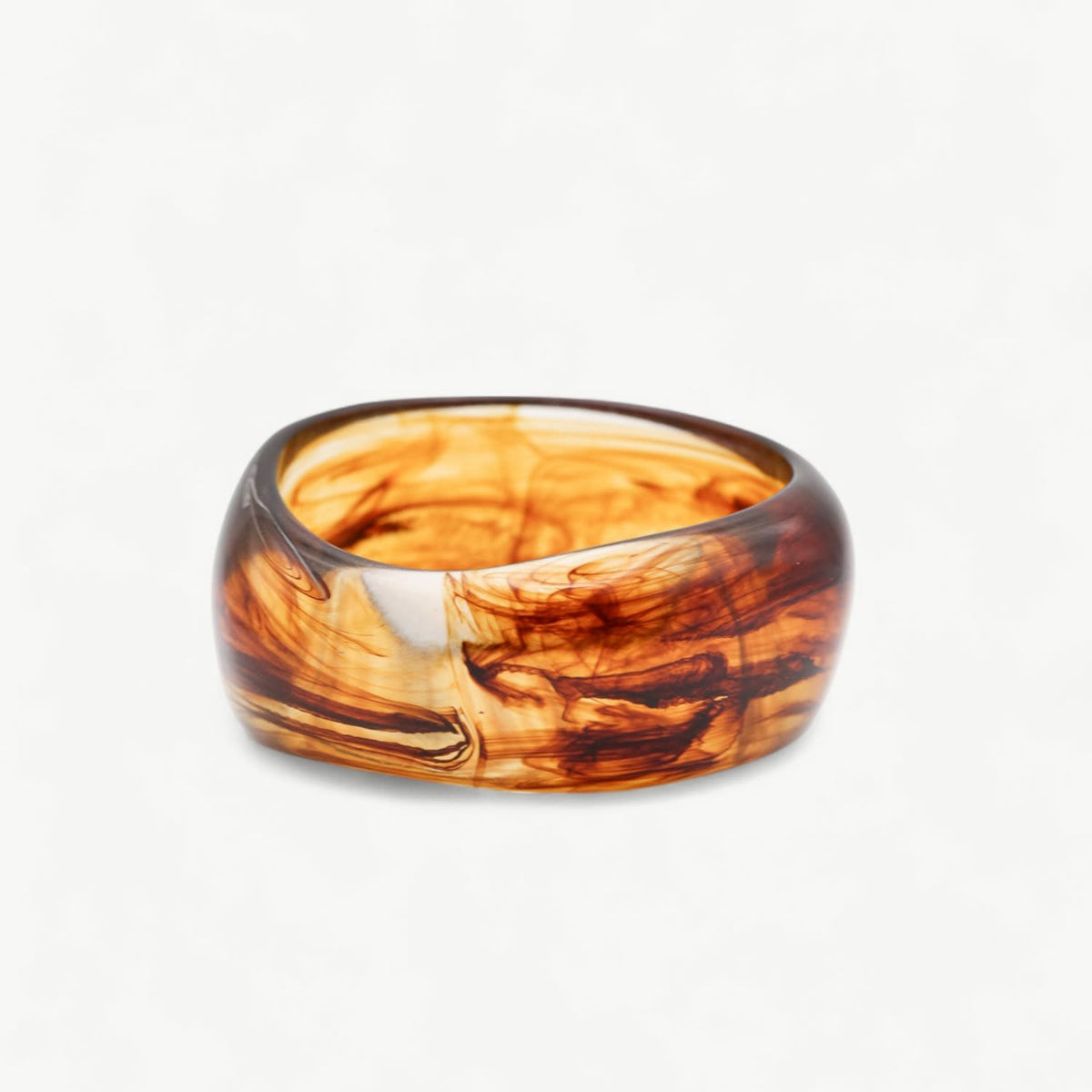 The Amber Drift Bangle by Miss Cecilia captures the mesmerizing flow of molten earth with its unique marble effect design. This lightweight resin bangle evokes a sense of dynamic movement, celebrating natural beauty through its swirling patterns. It's a sophisticated accessory that reflects the organic elegance of nature's artistry, perfect for those who appreciate subtle yet striking craftsmanship.